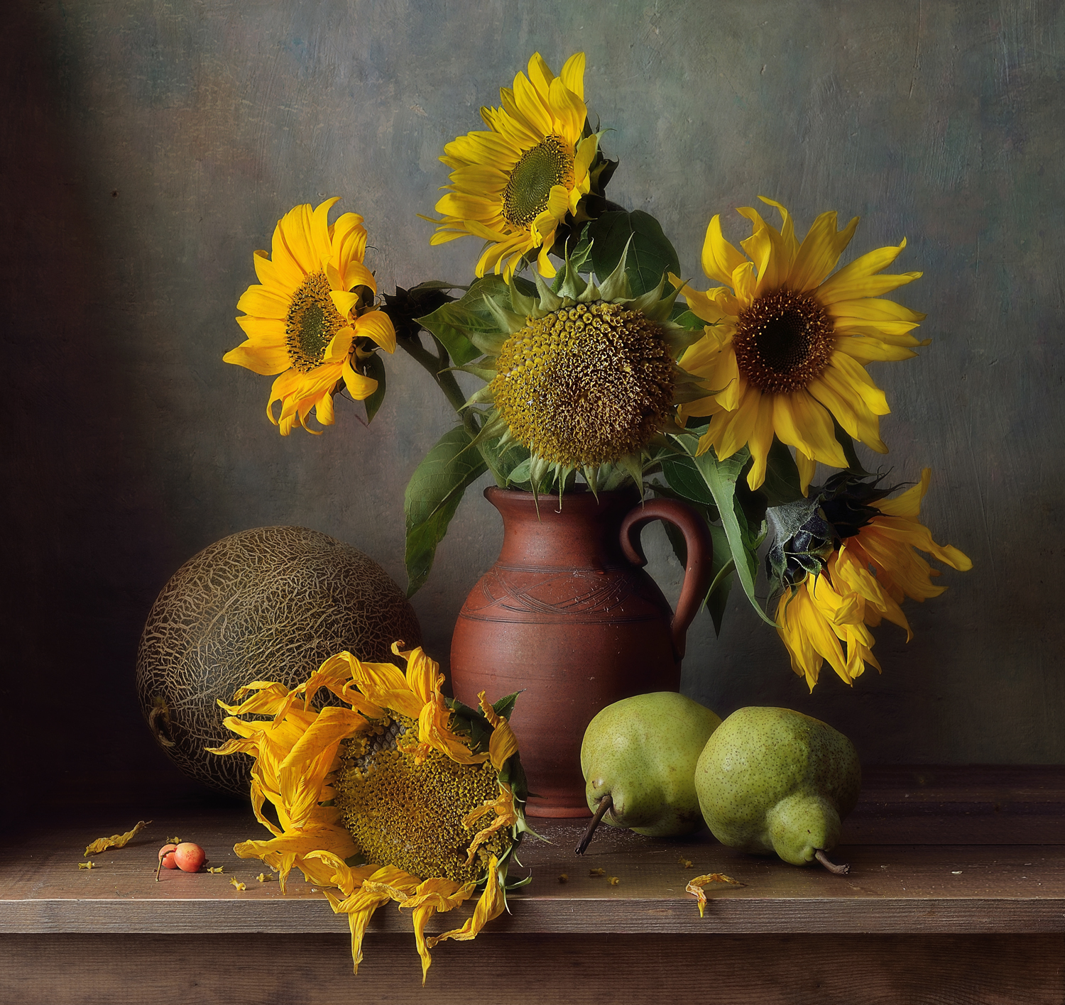 натюрморт,подсолнухи,букет,дыня,груши, Наталия К