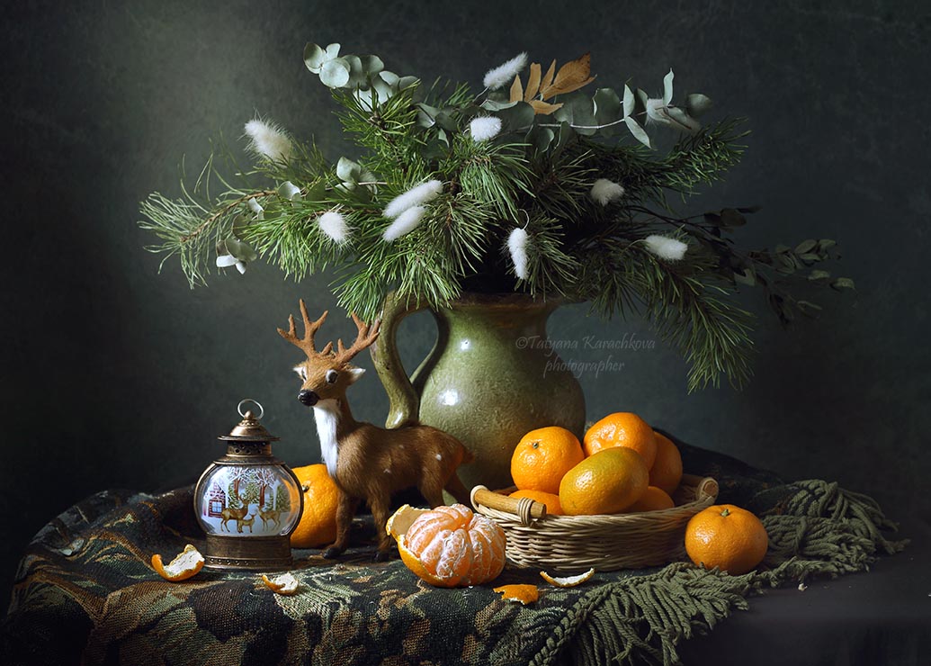 натюрмортзимнийзимний букетоленьптичкамандаринысвечашандалфизалистыкваокно