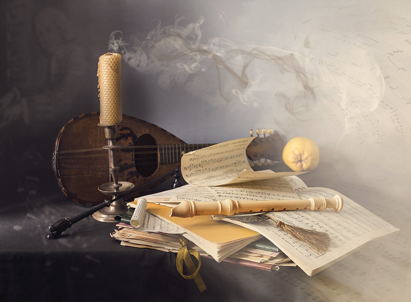 натюрморт, мандолина, флейта, ноты, свеча,, Tatyana Karachkova