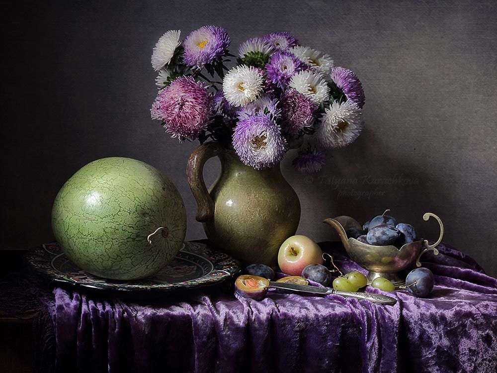 натюрмортцветыастрыдынявиноградяблокиарбузсливылиловыйбархатвазакувшин