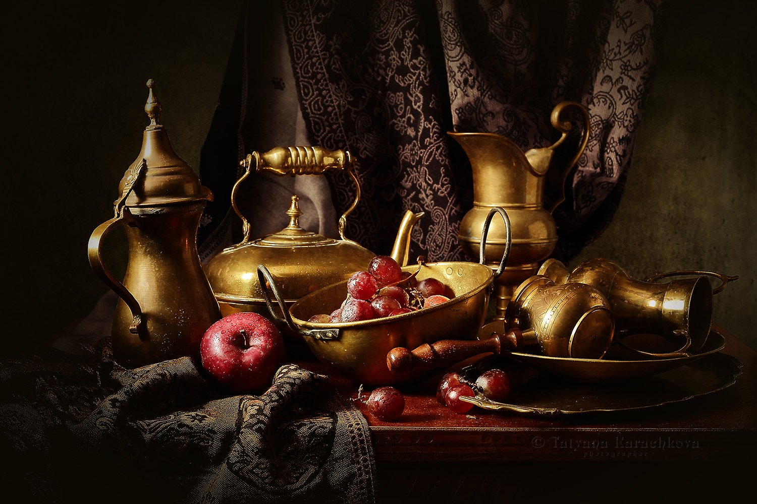 натюрморт,  посуда, фрукты, виноград, яблоко, кофейник, чайник, кувшин, Tatyana Karachkova