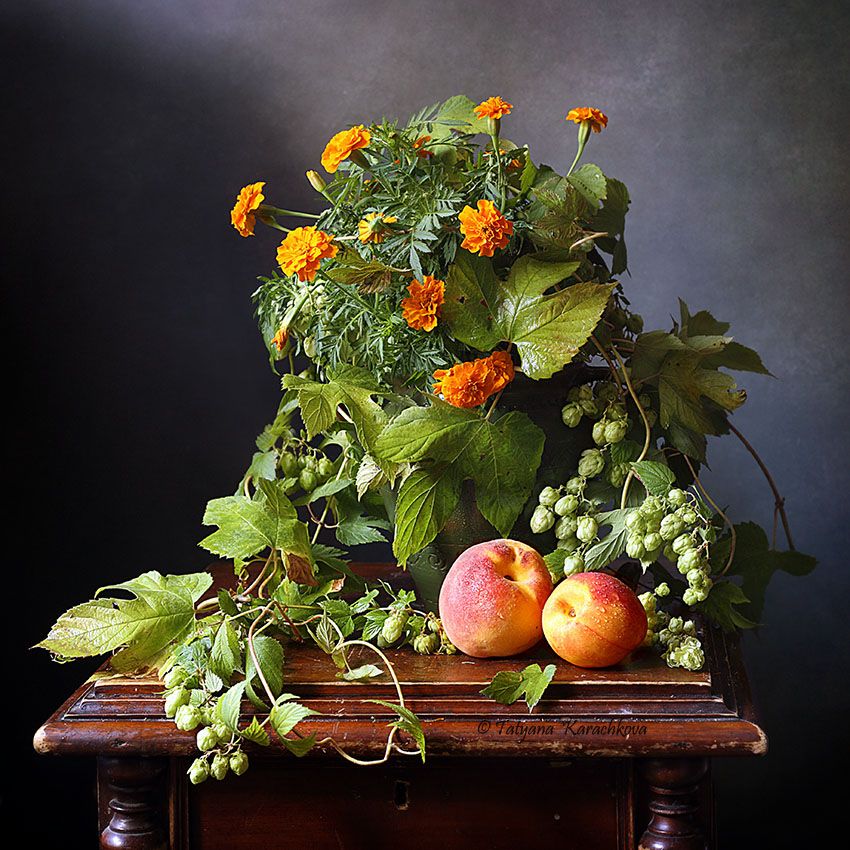 натюрморт, цветы, бархатцы, персики, хмель, Tatyana Karachkova