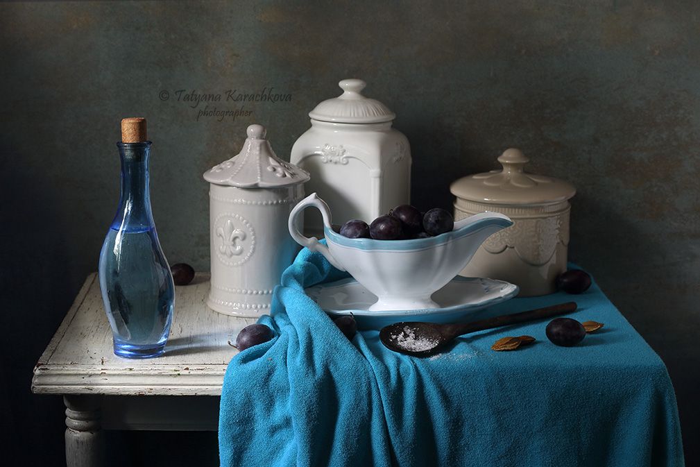 натюрморт, банка для сыпучих, сливы, соусник, кузнецовский фарфор, Tatyana Karachkova