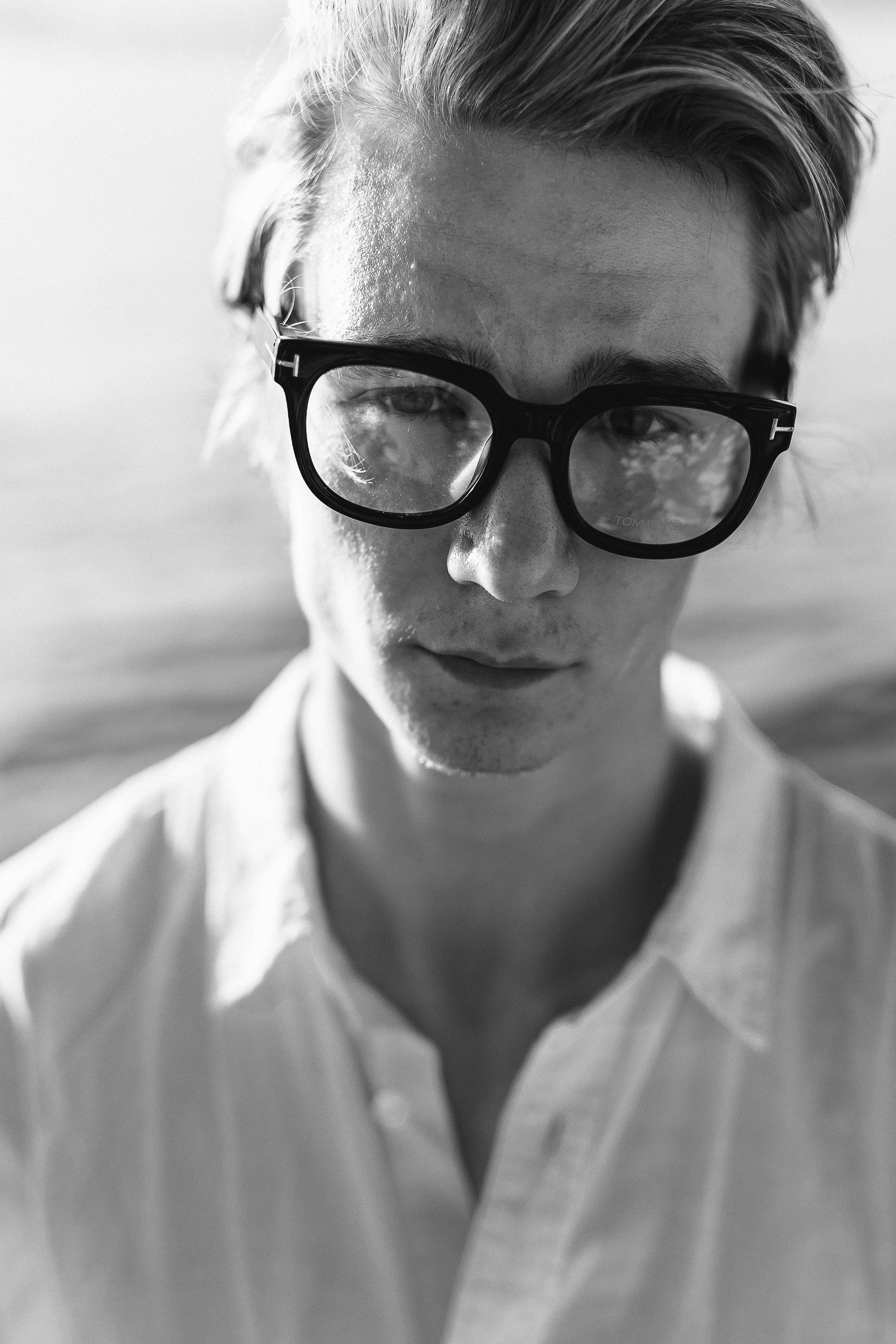 Вы передали глубину взгляда — стекла очков отражают свет, словно скрывают внутренний мир. Белая рубашка и чёткий контраст — простота, но с силой.
