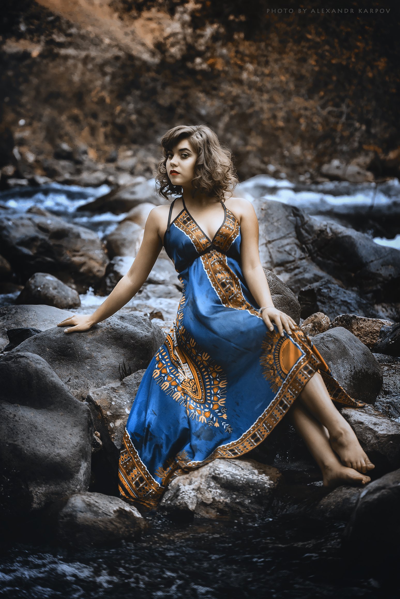 Речка, девугка, камни, горы, природа, платье, вода, Карпов Александр