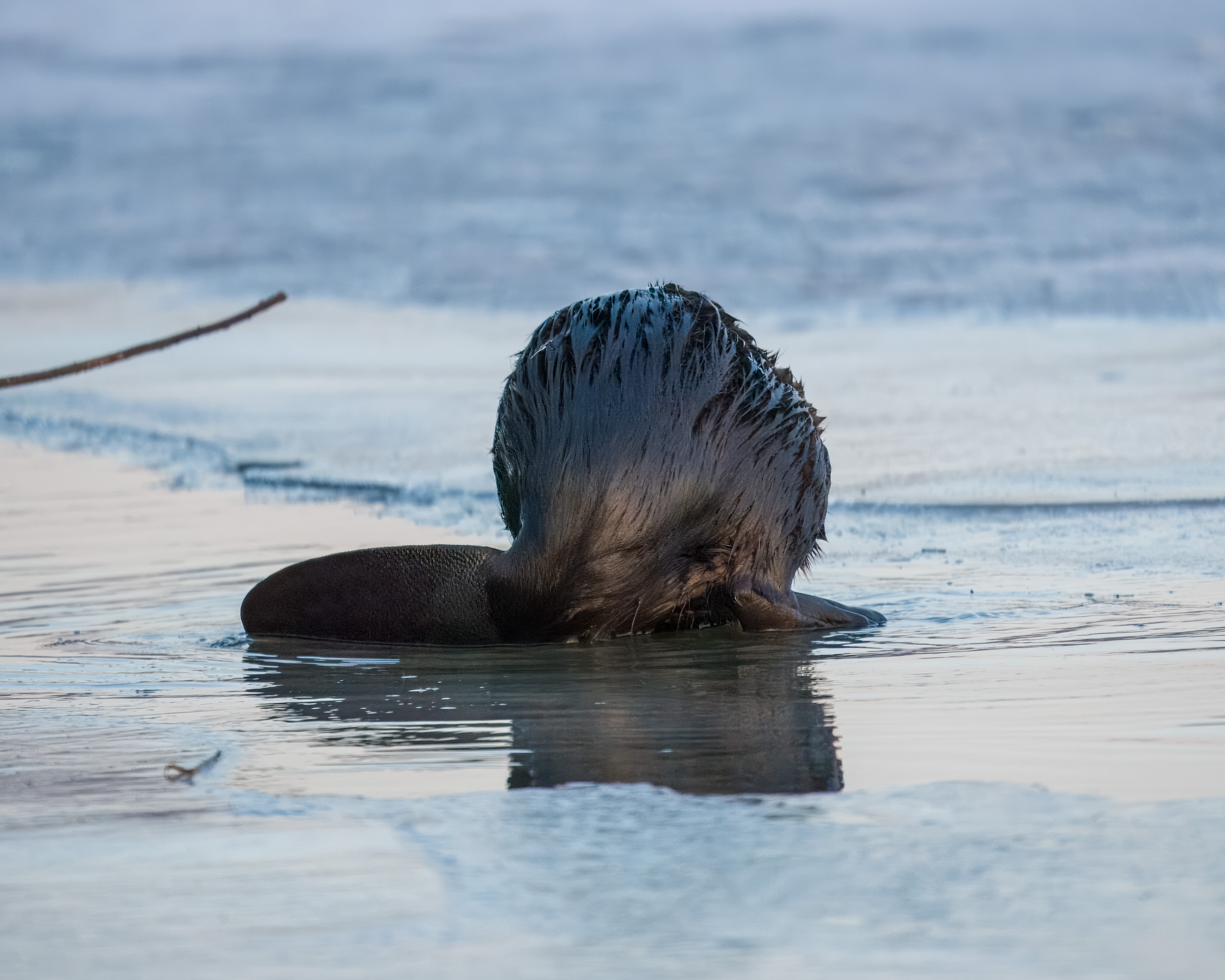 Охотилась за ондатрой, но внезапно встретила настоящего хозяина этих мест. Пока я осторожно и стараясь не делать лишних движений фотографировала мою любимую мускусную крыску, обедавшую добытыми со дна водоема корешками, вода в небольшой полынье прямо передо мной внезапно вскипела и показалась огромная морда с маленькими глазками. От неожиданности я отпрянула, а обладатель морды резко ушёл под воду обдав меня и фотоаппарат брызгами и помахав на прощание хвостом, прямо как кит! Трудно передать эмоции которые я испытала, меня поймут только настоящие фотоохотники!). Адреналин был просто на пределе. И следующие 3 часа я провела в надежде, что неожиданный гость вернется. На ледяном, совсем не весенним ветру, стараясь лишний раз не шевелиться, под крики ставших неинтересными коршунов, до боли всматриваясь в гладь небольших полыней и надеясь угадать где в следующий раз появиться это симпатичное бревнышко. А он не спешил на свидание со мной - я слышала громкий хруст веток за мысом, иногда прямо под небольшой платформой рыбаков, на которой я устроила засаду, проплывала темная тень, сильно трещал лёд и бурлила вода. И вот когда я уже перестала себя уговаривать подождать ещё 10 минут и когда солнце почти село - это мохнатое чудо соизволило мне попозировать!