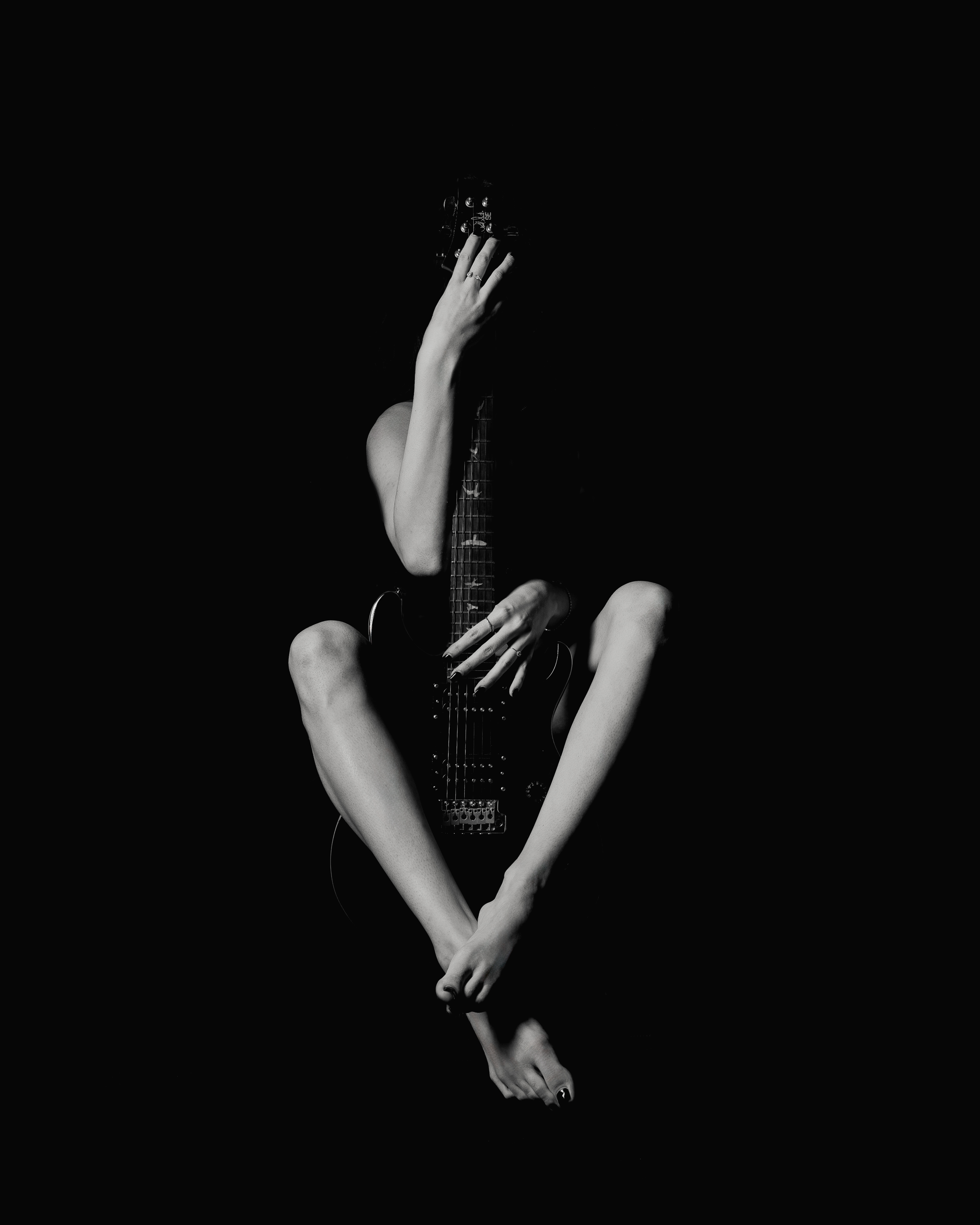 guitar, black and white, model, legs,  Jean