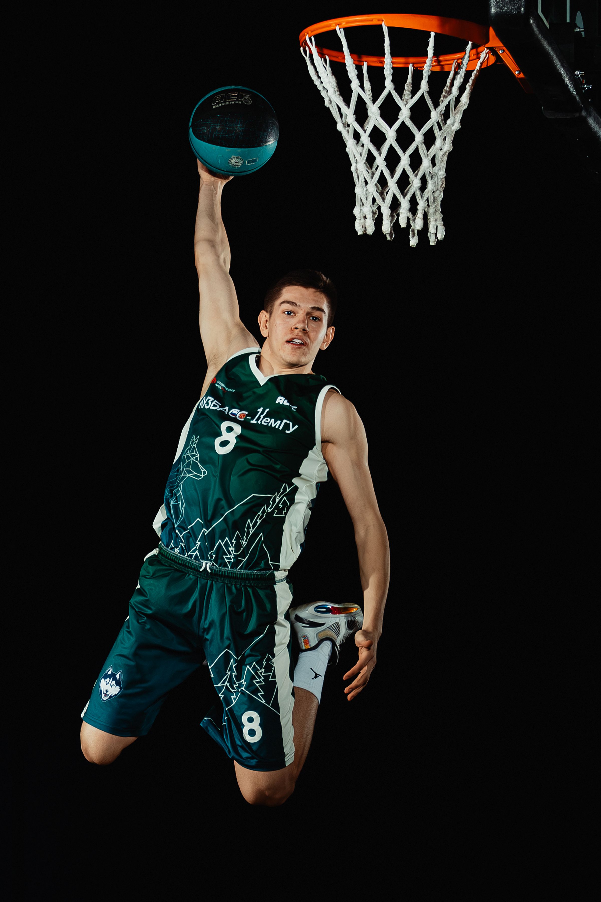Фотография передаёт динамику прыжка баскетболиста в момент броска — поза естественная, освещение акцентирует фигуру на чёрном фоне. Композиция чёткая, но можно было бы чуть сильнее выделить лицо и детали формы.
