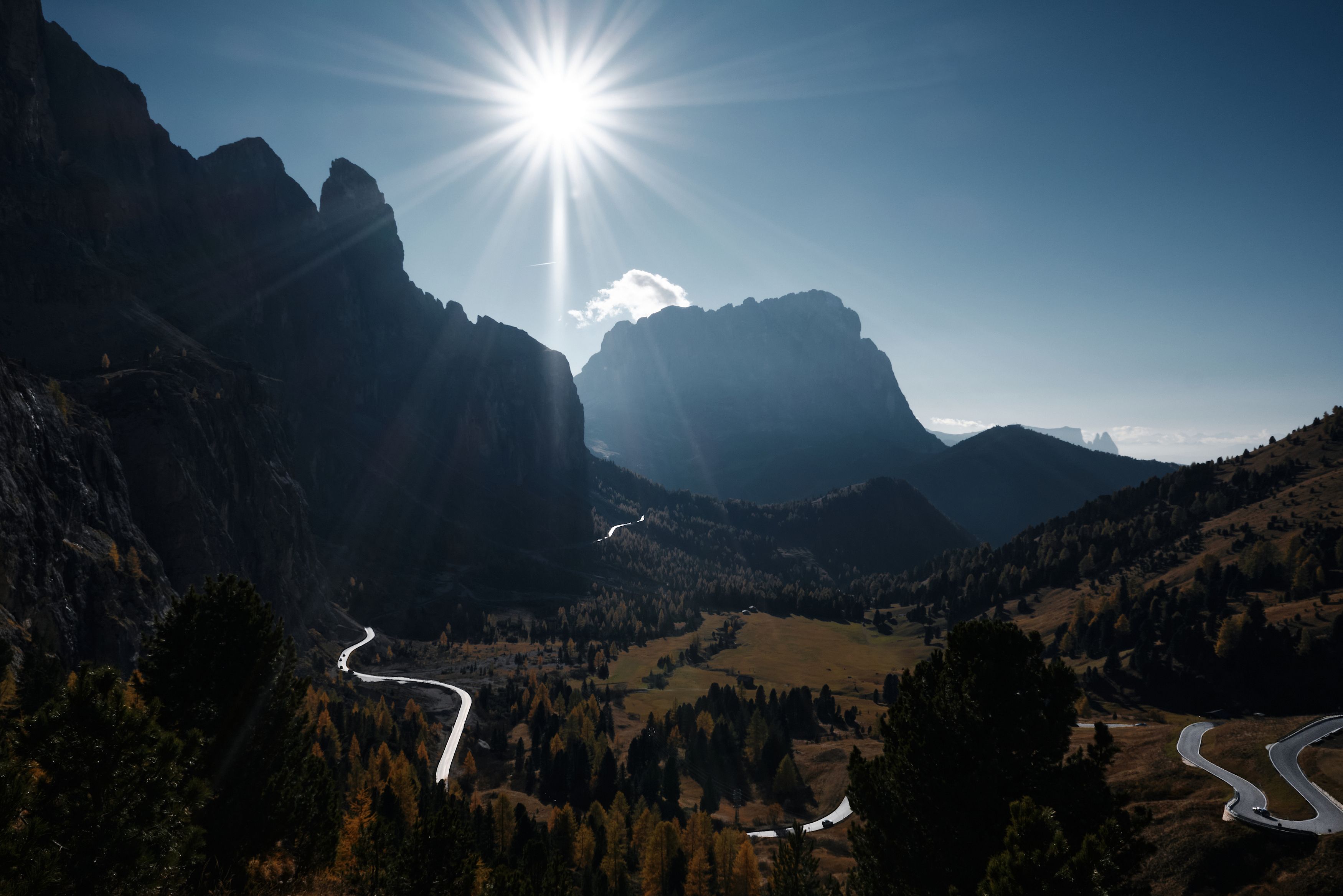 Пассо-Гардена с таким солнцем — это всегда драма и красота. Свет действительно режет дорогу, как ножом, и это работает. Но если хотите усилить эффект — попробуйте чуть поднять тени в долине или добавить контраста на переднем плане, чтобы глаз не терялся в темноте. Иначе путь кажется слишком «тонким» по сравнению с масштабом гор. В остальном — сильная сцена, просто нужно немного довести баланс.