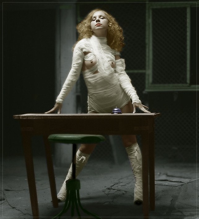 левая нога (для нее левая, а не с нашей точки зрения) особено апликационно выглядит, а тень от правой идет вправо-назад, тогда как тень от стола практически не смещена и находится прямо под ним. далее: резкость на модели, стол и стул якобы не попадают в ГРИП и находяться в блюре, НО звонок на столе, находящийся соответственно на той же дальности, что и стол, в идеальной резкости, а сельчак стула, который вообще ближе стола, белее резкий, чем стол: как так?!