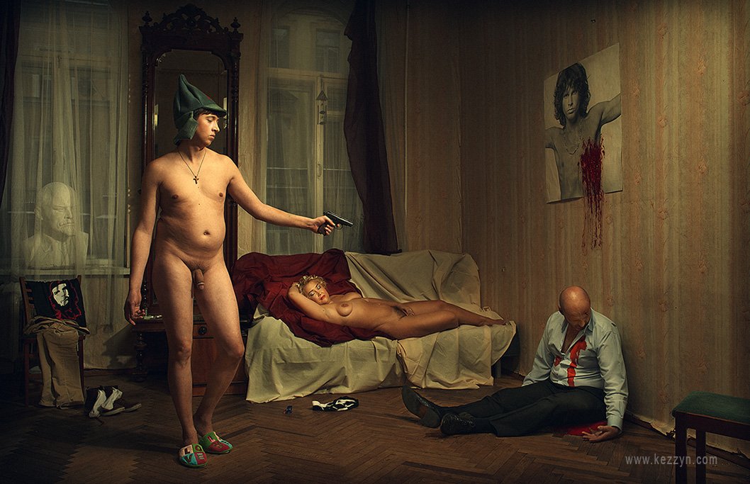 (для тех кто... не в курсе: "The End" - одна из самых известных песен "The Doors" (а на постере Джим Моррисон) .. по моему одна из самых сильных его песен... там английский очень простой и понятный... поэтому мне и текст близок... PS Ещё про аллюзии... "Маху обнаженную", надеюсь все узнали? или можно её "Спящей Венерой" назвать- Гойя у Джорджоне позу позаимствовал) А вот поза мужика.. никак не могу вспомнить: думал Давид - нет , другая поза... Что то из Тициана.. но вот как называлась? Но поза - один в один