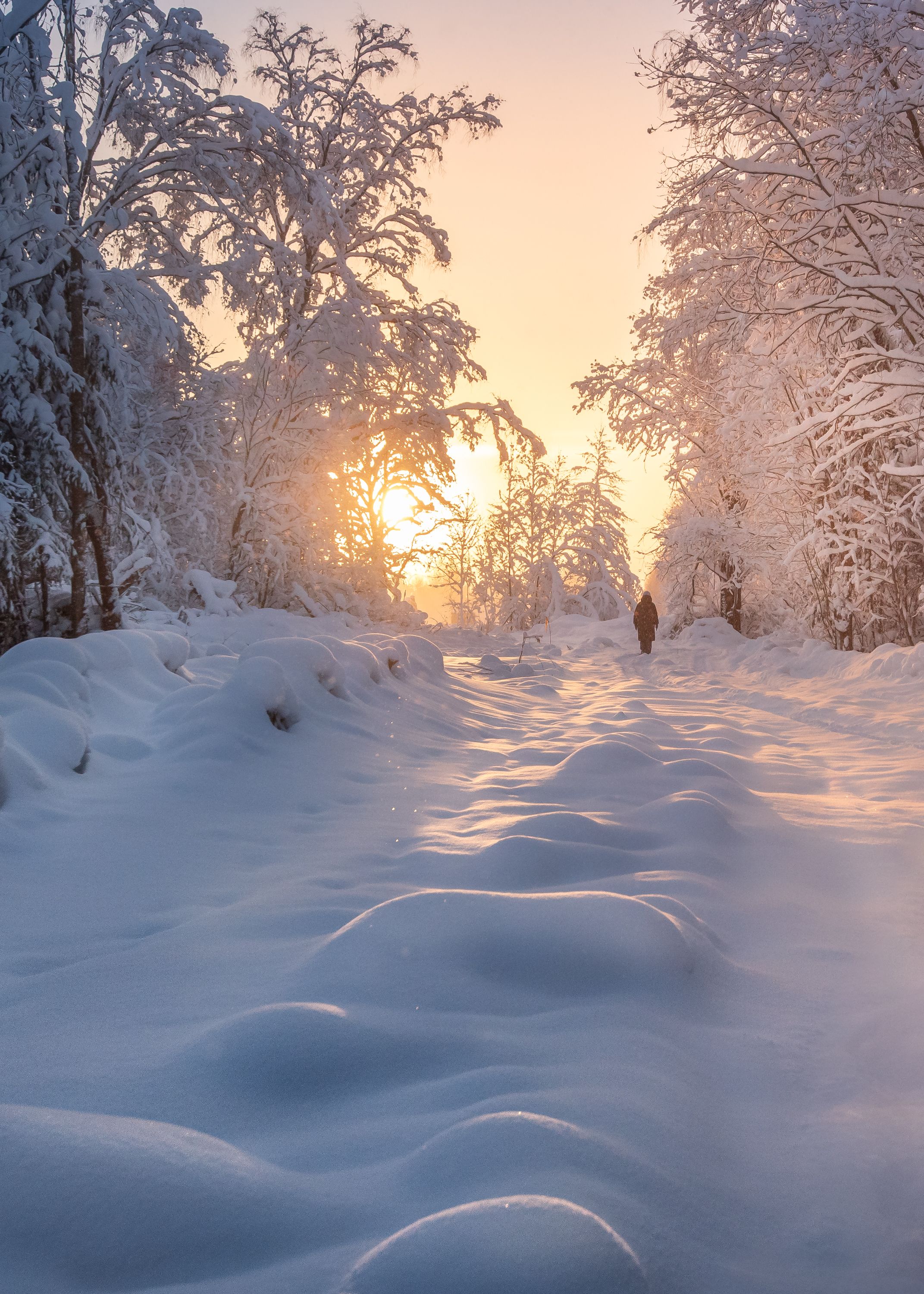 Тут всё прекрасно! Есть и дорожка плавно уходящая в поворот и закатное солнце освещающее ее. А человек хорошо это дополняет.