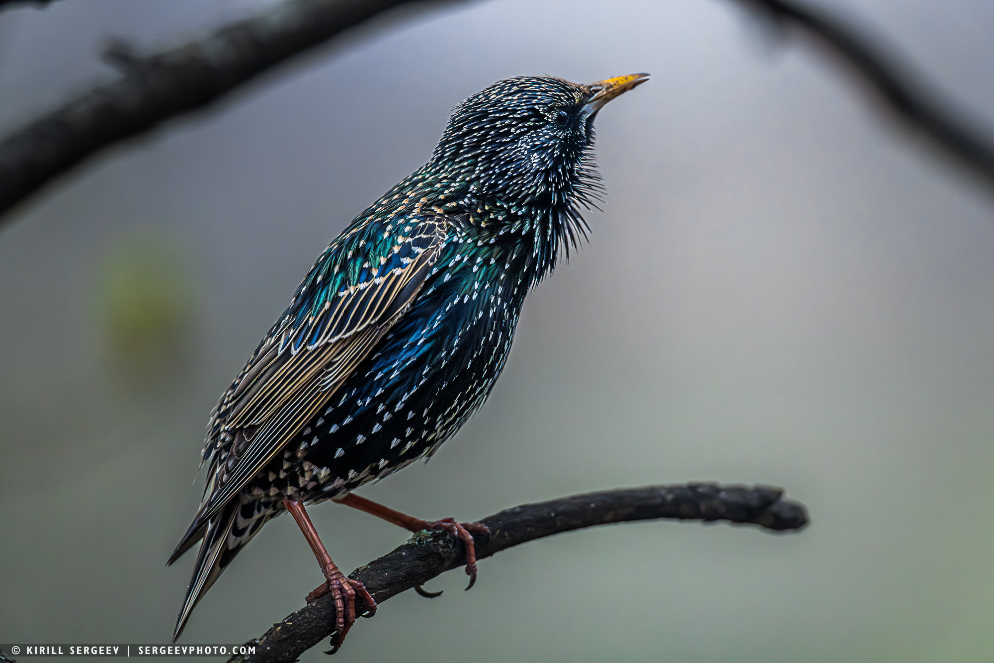 Скворец сидит важным, слегка взъерошенным комочком, и его чёрное оперение внезапно вспыхивает фиолетовыми и зелёными отблесками. Он то задумчиво смотрит вдаль, то вдруг вскидывает голову и заливается задорной трелью, будто рассказывая ветру все свои весенние новости...