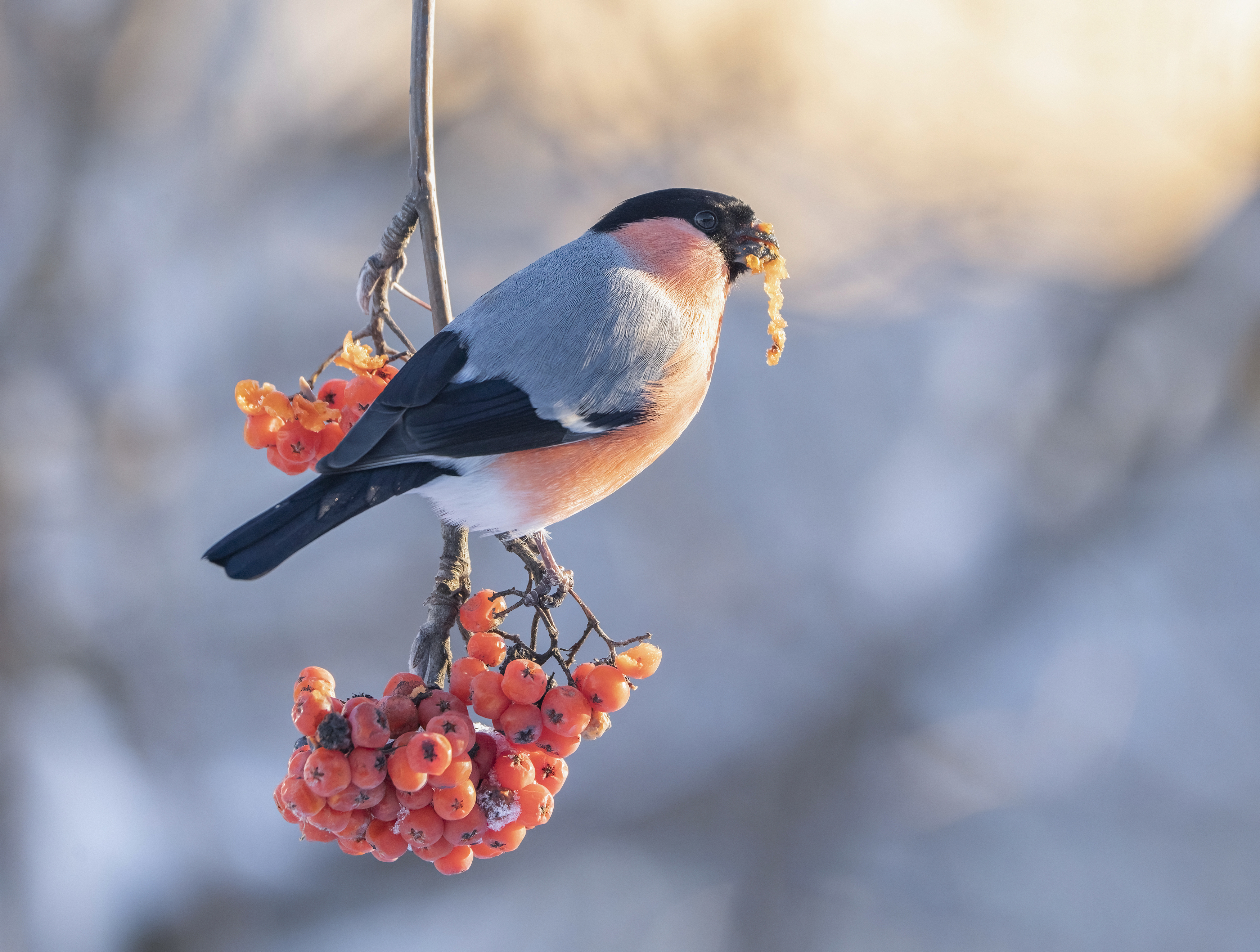 Вы отлично поймали момент — снегирь на ветке с яркими ягодами, контраст цветов и света выделяет птицу на фоне зимнего размытия. Композиция чёткая, акцент — на птице и её действии. Очень естественно и живо.