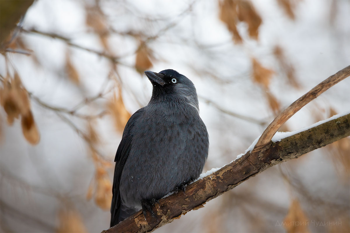 Птица на ветке — спокойно, чётко, в зимнем свете. Глаза у неё как будто смотрят вдаль. 👀