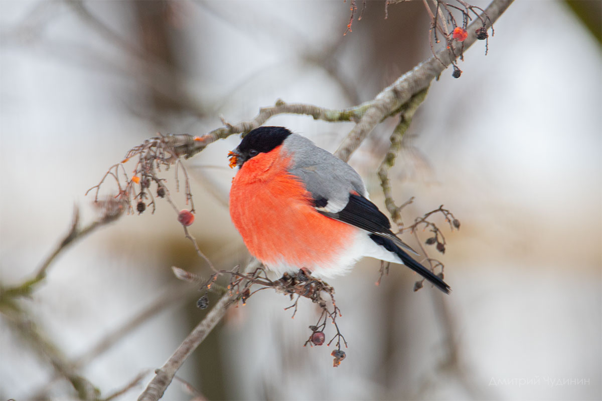 Снимок передаёт атмосферу зимнего дня — птица на ветке с ягодами, мягкий фон, хорошая фокусировка на объекте. Можно чуть сильнее выделить контраст, чтобы красный брюшной покров был ещё выразительнее.