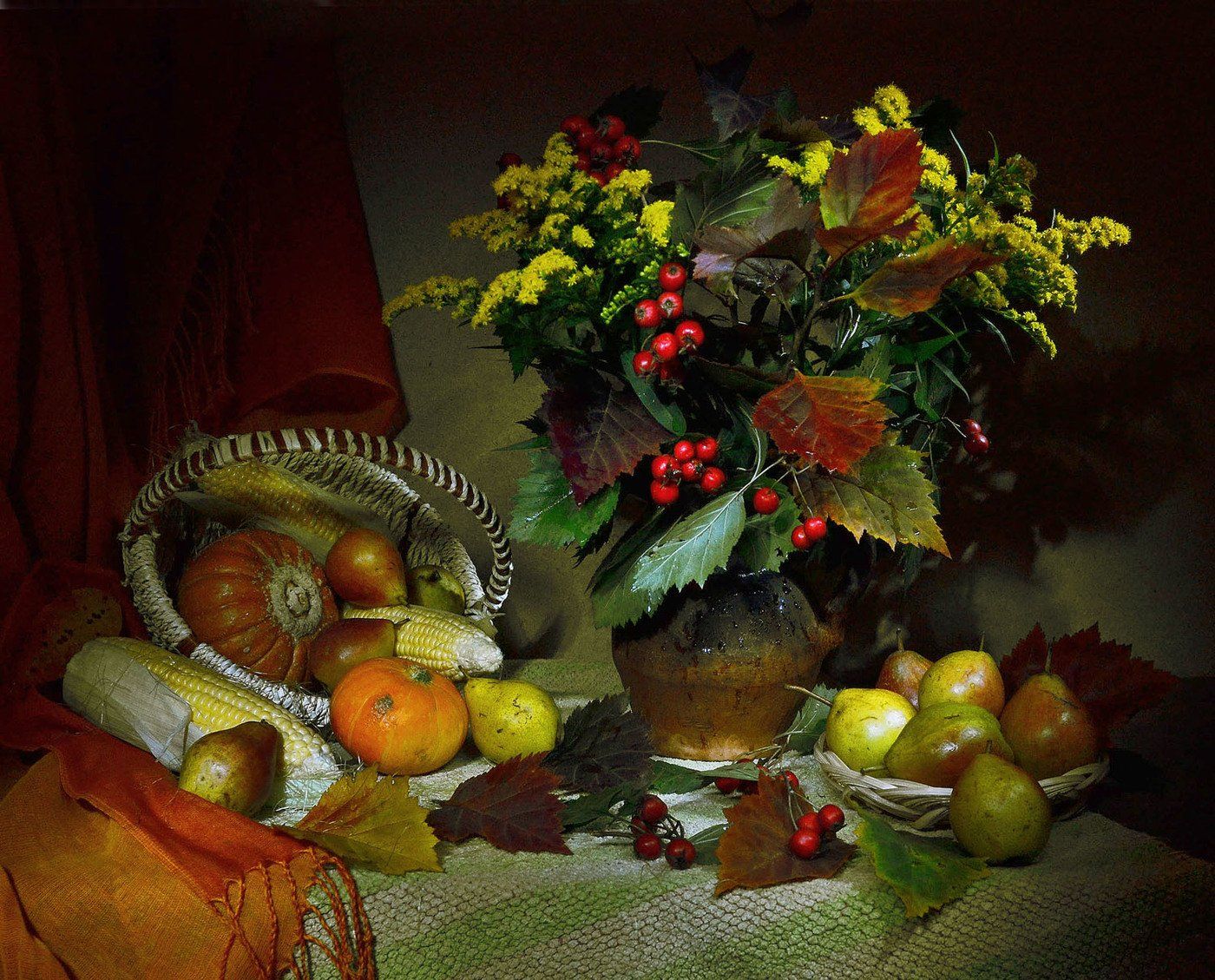 still life,натюрморт,фото натюрморт,осень, октябрь , кукуруза,  листья, груши, тыква, Колова Валентина