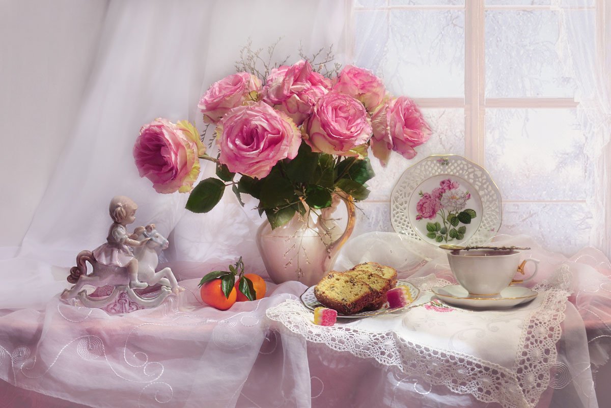 still lif,  натюрморт, чай, цветы, фото натюрморт,розы, фарфор, статуэтка, мандарины, на исходе ноября, осень, Колова Валентина