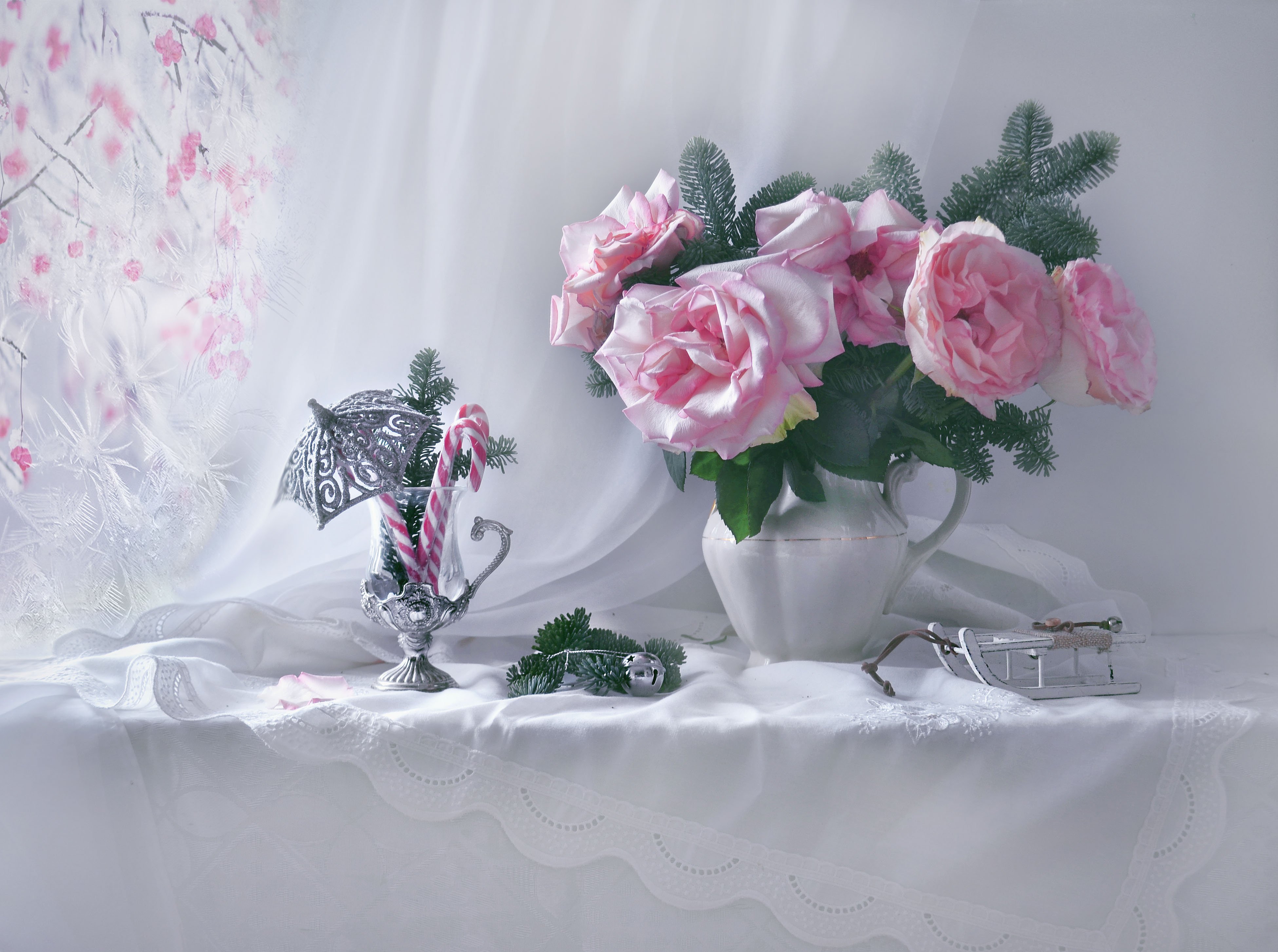 А розы белые с насыщенной розовой каёмочкой...И со свечой есть вариант, чуть позже...