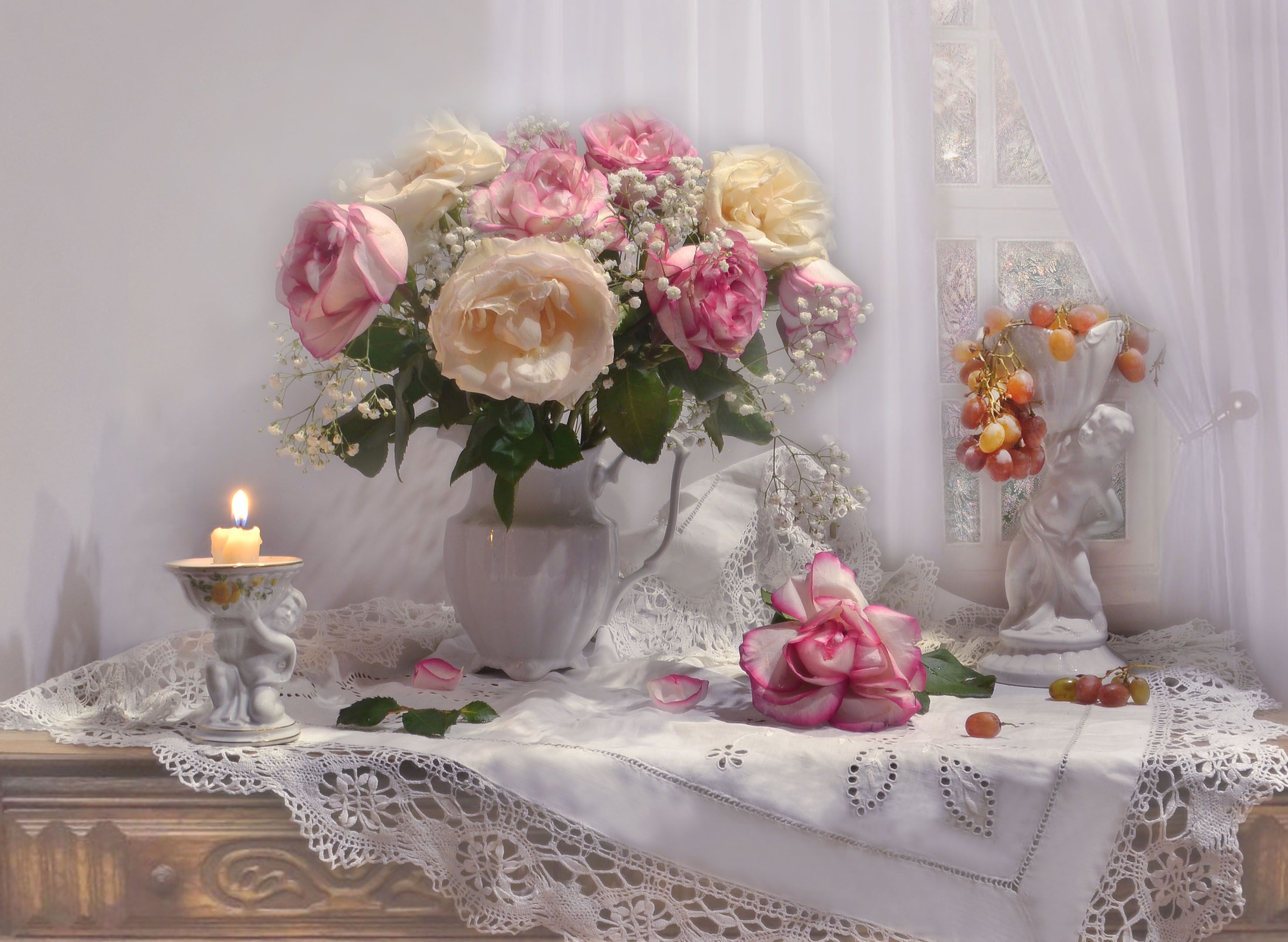 в белоснежных роз лепестки,