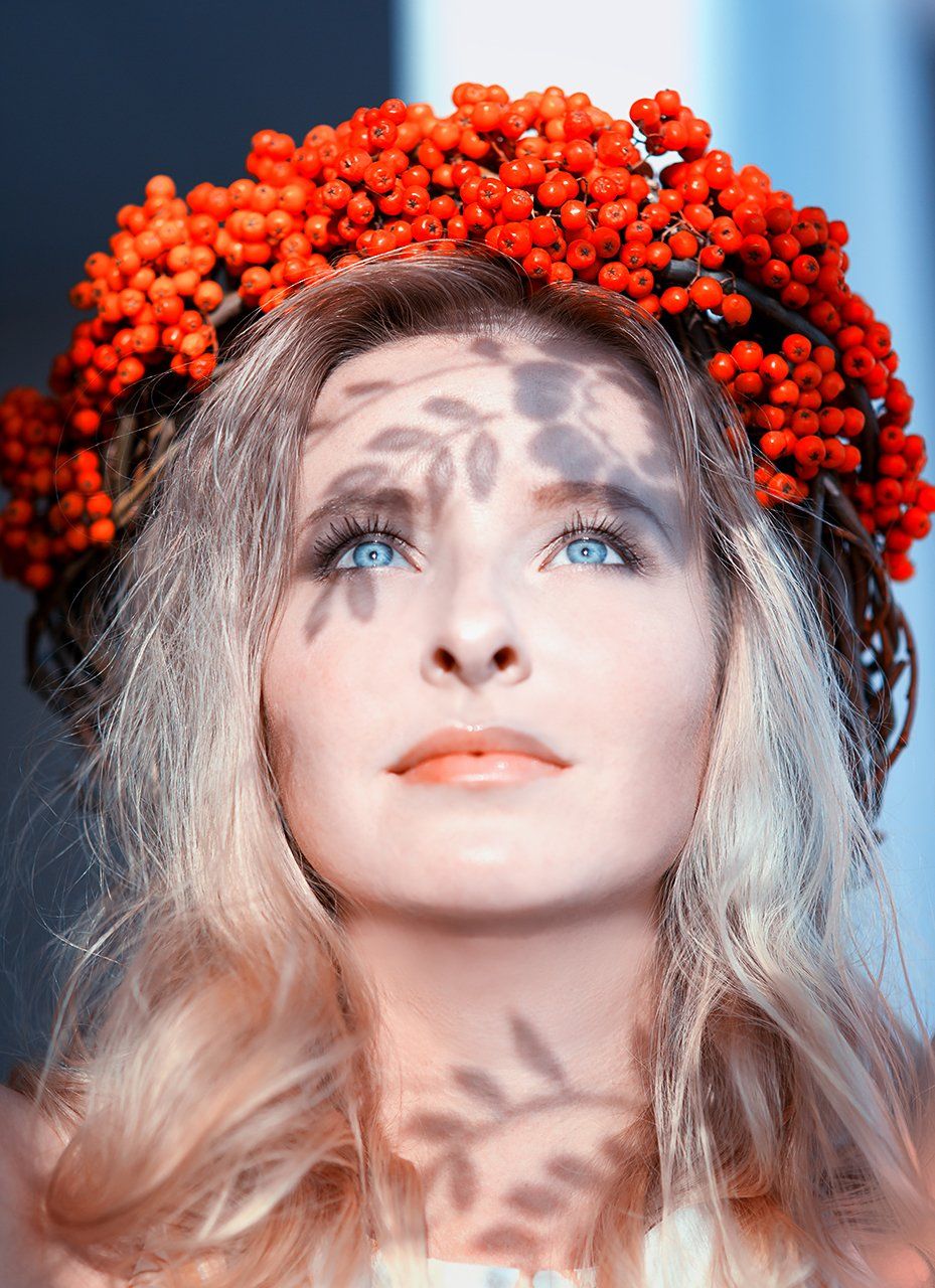 девушка, рябина, красивая, глаза, взгляд, красная, голубые, тень, листья, венок, блондинка, Дарья Комарова