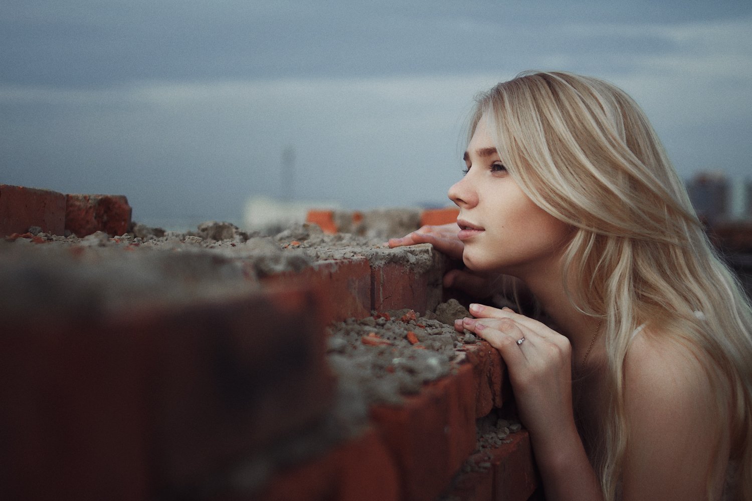 девушка, портрет, небо, город, стена, кирпичи, Иван Копченов