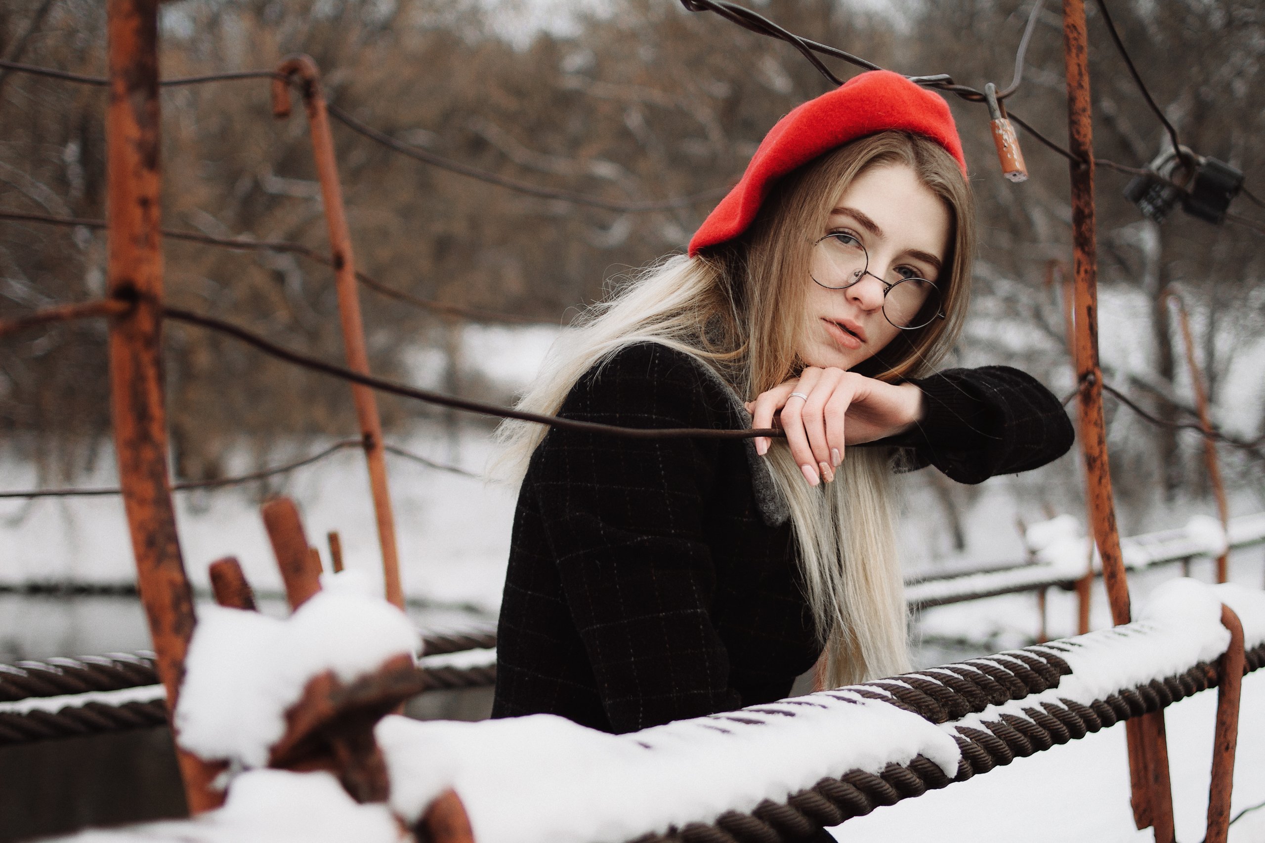 девушка, портрет,  натуральный свет,  снег, зима, холод, мост, очки, берет, речка, Иван Копченов