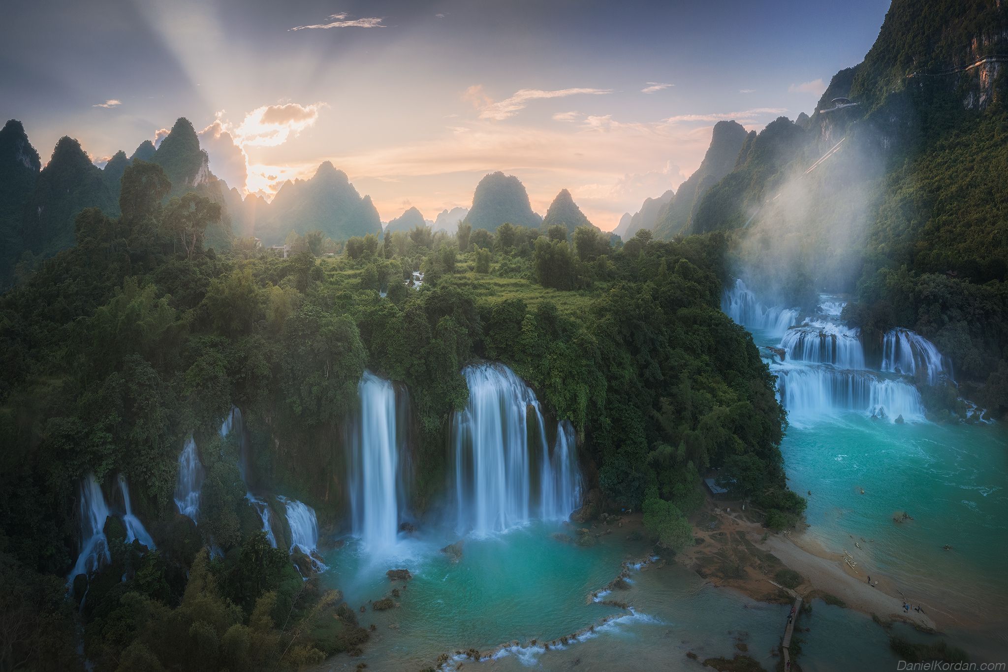 Воздушный вид на живописные водопады, врезающиеся в зелёные склоны гор, с бирюзовой водой, отражающей небо. Солнце, встающее за вершинами, пронизывает туман, подчёркивая дикую красоту вьетнамской природы. Снимок передаёт гармонию и мощь природы в момент пробуждения.