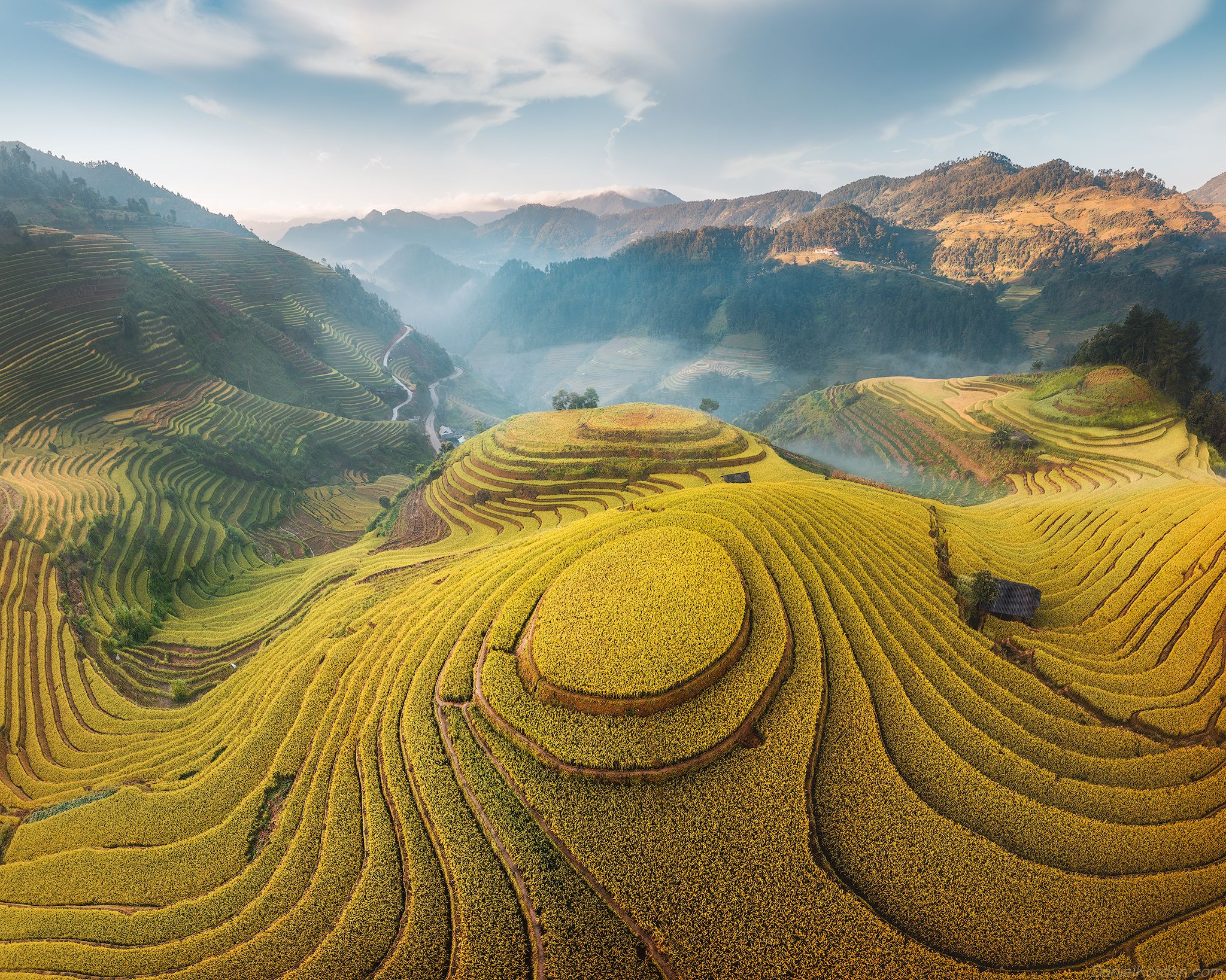 На снимке запечатлены рисовые террасы в горах Вьетнама, озарённые мягким утренним светом. Золотистые поля изгибаются по склонам, образуя сложные узоры, вдали — туманные долины и хребты. Фотография передаёт гармонию между человеком и природой, отражая традиционные методы сельского хозяйства в горных районах. Работа Даниила Коржонова.