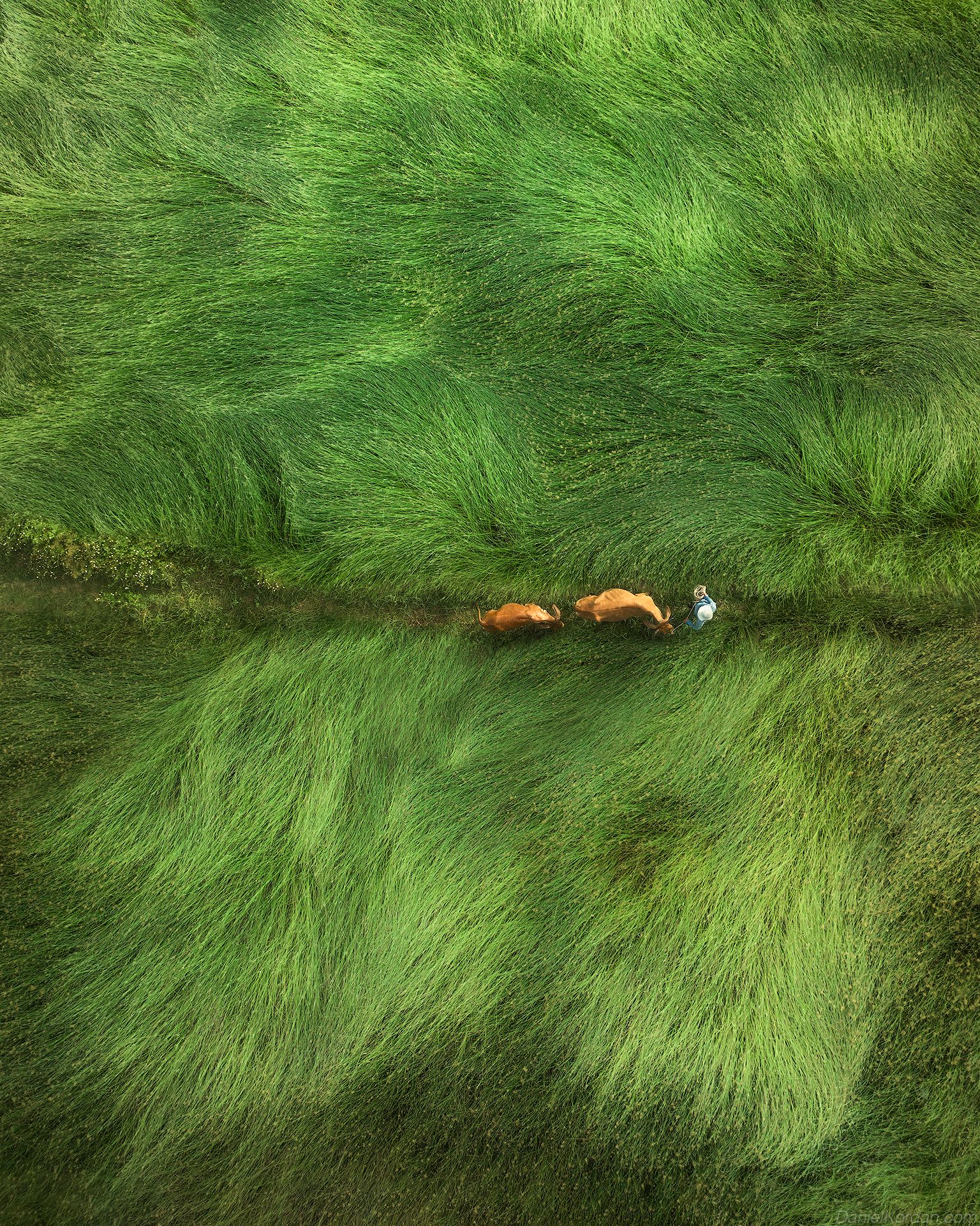 Аэрофотоснимок Даниила Коржонова запечатлел бескрайнюю зелёную равнину, где три фигуры в оранжевых одеждах движутся по узкой тропе. Контраст ярких тонов одежд и насыщенной растительности создаёт визуальный акцент, подчёркивая масштаб природы и человеческое присутствие в ней. Снимок передаёт спокойствие и гармонию сельского ландшафта Вьетнама.