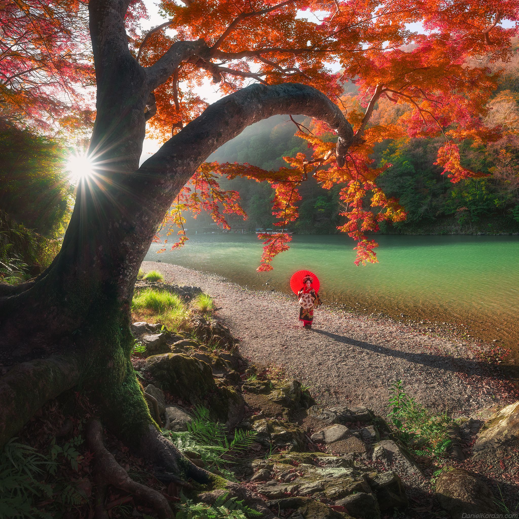 На берегу тихого озера в Киото, под раскидистым клёном с огненной листвой, идёт человек с красным зонтиком. Солнце, пробивающееся сквозь ветви, создаёт игру света и тени, подчёркивая спокойствие и красоту осеннего пейзажа. Сцена передаёт традиционную японскую эстетику — гармонию природы, уединение и тонкую грусть уходящего сезона. Фотография отражает дух Киото, где природа и человеческая фигура сливаются в едином кадре.