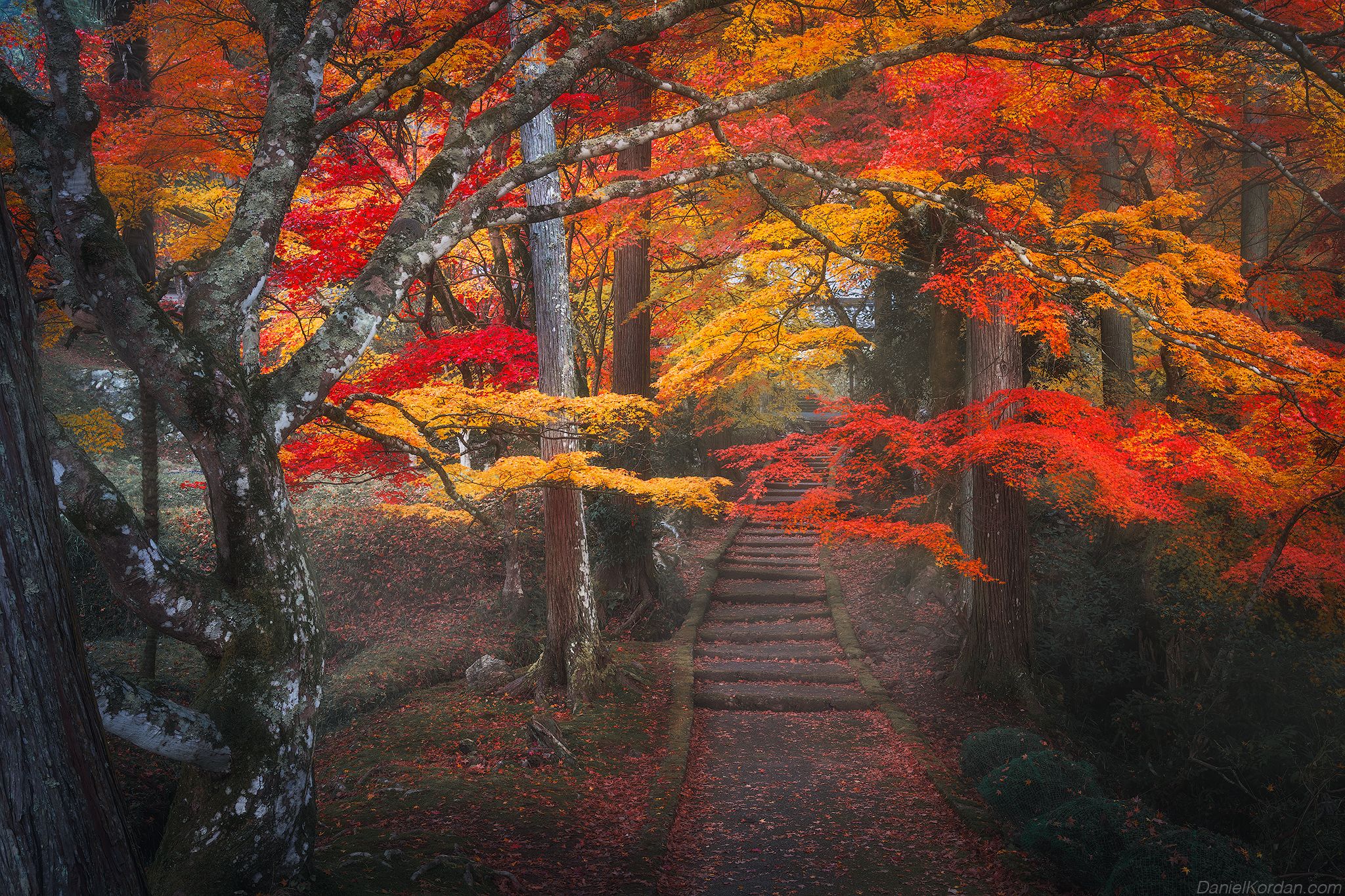 В сердце Киото раскинулся лес, окутанный теплыми оттенками осени. Каменная тропа уходит вглубь, обрамлённая деревьями с ярко-красными и золотистыми листьями. Солнечные лучи пробиваются сквозь кроны, создавая игру света и тени. Каждый шаг по тропе — как погружение в тихую гармонию природы. Фотограф Даниил Коржонов запечатлел эту сцену с особой чувствительностью к цвету и свету, передав атмосферу спокойствия и красоты японской осени.