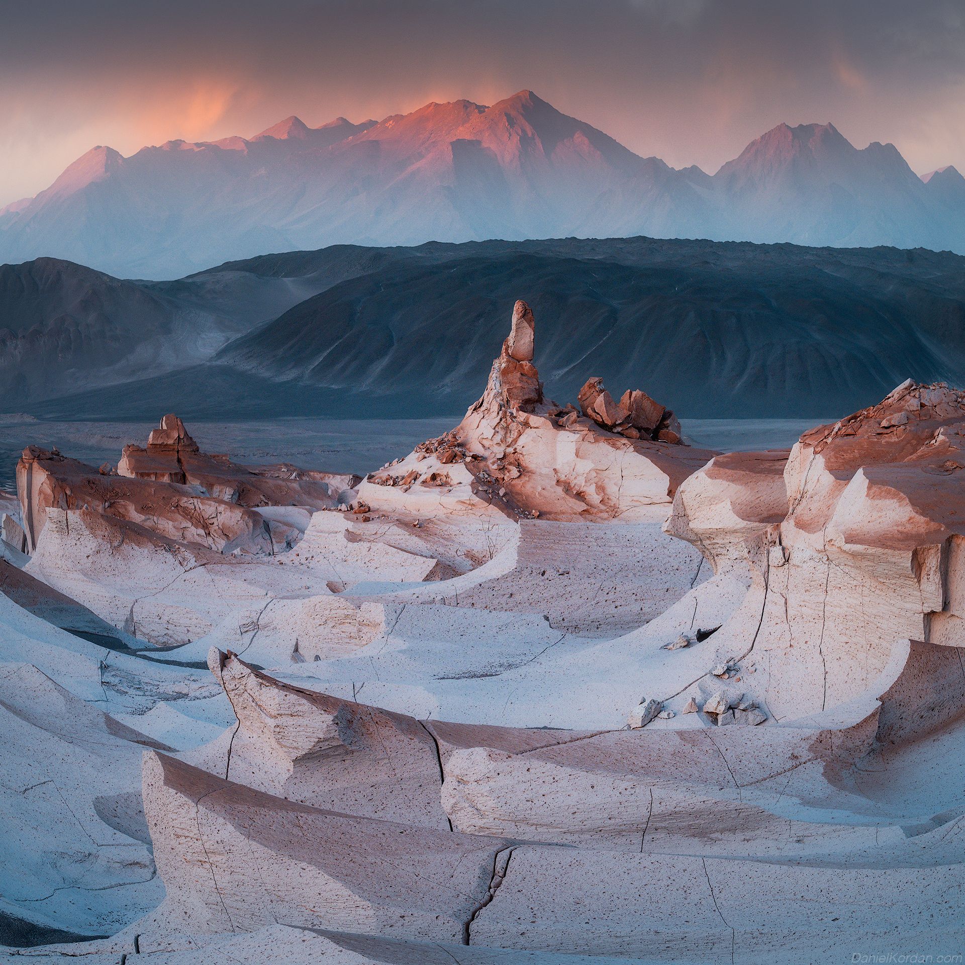 На снимке Даниила Коржонова — суровая красота Пуны де Атакама, высокогорной пустыни на севере Чили. Свет заката мягко охватывает выветрившиеся скальные образования, создавая контраст между холодной белизной переднего плана и теплыми тонами горного хребта. Каждая деталь — от трещин в камне до теней на склонах — говорит о мощи природных процессов, формирующих этот уникальный ландшафт.