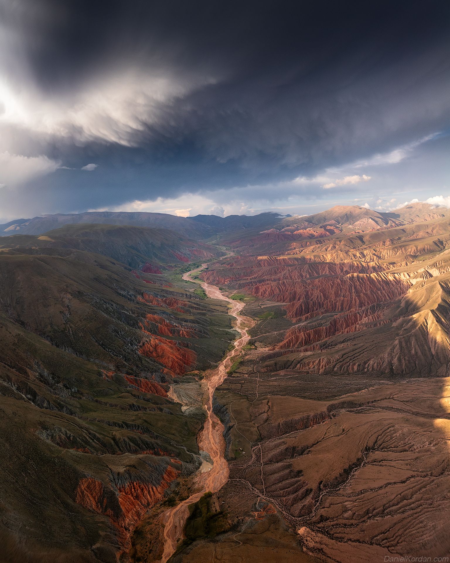 Вид с высоты на каньон в Пуне Атакама, где резкие контуры скал и извилистая река создают драматическую композицию. Тяжёлые облака на горизонте предвещают бурю, подчёркивая суровую красоту андского ландшафта. Красные породы, выветрившиеся за миллионы лет, соседствуют с редкими зелёными участками, где вода сохраняет жизнь. Фотография передаёт масштаб и мощь природы в одном из самых сухих регионов планеты.