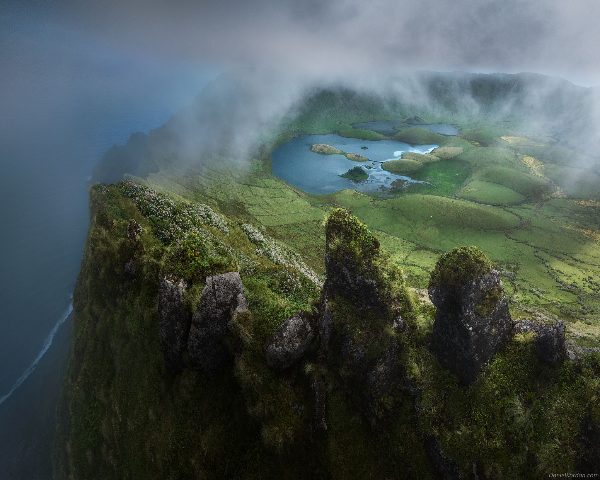 На снимке Даниила Коржонова Азорские острова предстают в своей первозданной дикости — зелёные склоны, обрамлённые туманом, и кратерное озеро, словно глаз планеты. Это место, где вулканическая история переплетается с мистикой природы. Каждый кадр — приглашение в мир, где время замедляется, а душа находит покой.