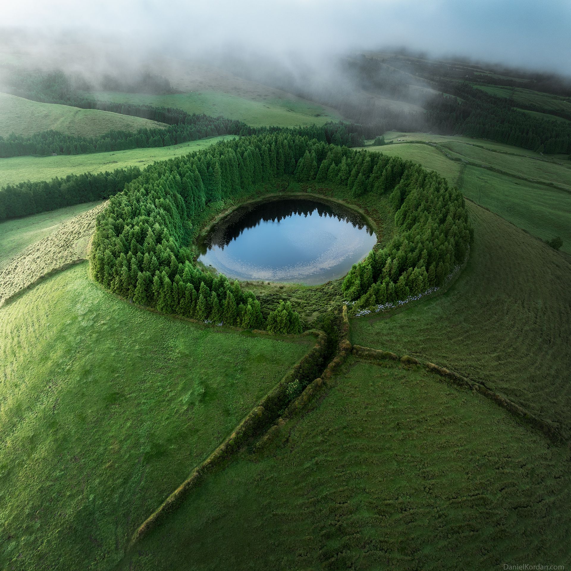 Аэрофотография Даниила Коржонова запечатлела вулканический кратер на Азорских островах — идеально круглое озеро, отражающее небо, в окружении плотного зелёного леса. Пейзаж, окутанный утренним туманом, выглядит как сказочное кольцо на земле. Снимок передаёт гармонию природы и геологическую историю островов.