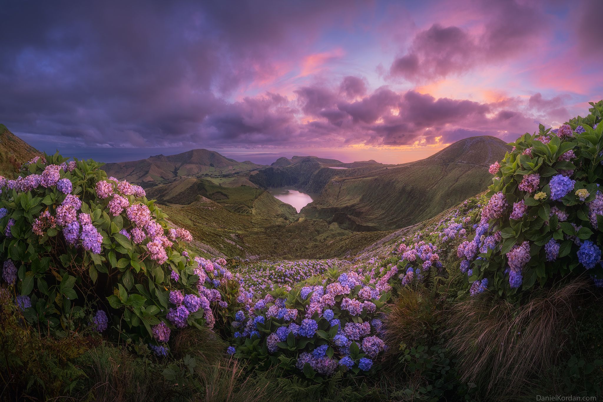 На снимке — захватывающий вид на Азорские острова в сумерках. Цветущие кусты в переднем плане контрастируют с глубокими тонами неба и зелёными холмами. Вдалеке — озеро, отражающее розовые и фиолетовые оттенки заката. Фотография передаёт спокойствие и величие природы в мгновении перехода дня в ночь.