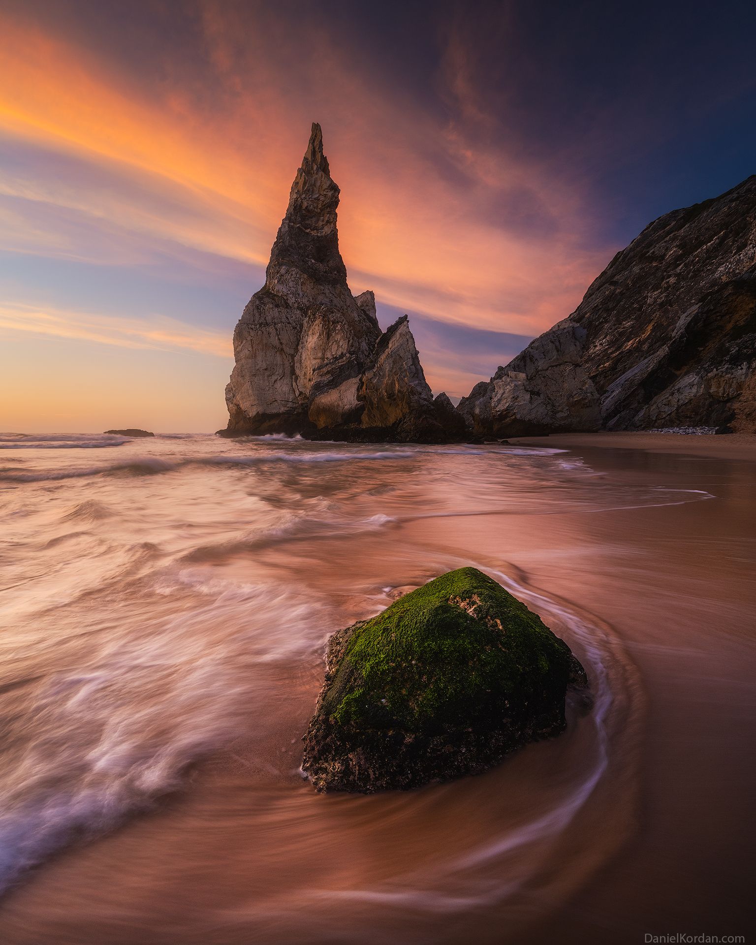 На берегу Азорских островов — место, где море встречается с небом в бурном танце света и воды. Длинная выдержка превращает волны в шёлковые потоки, а огненный закат окутывает скалы таинственным сиянием. Камень в переднем плане, покрытый мхом, словно свидетельствует о вечности. Это не просто пейзаж — это дыхание природы в момент её величайшей гармонии.