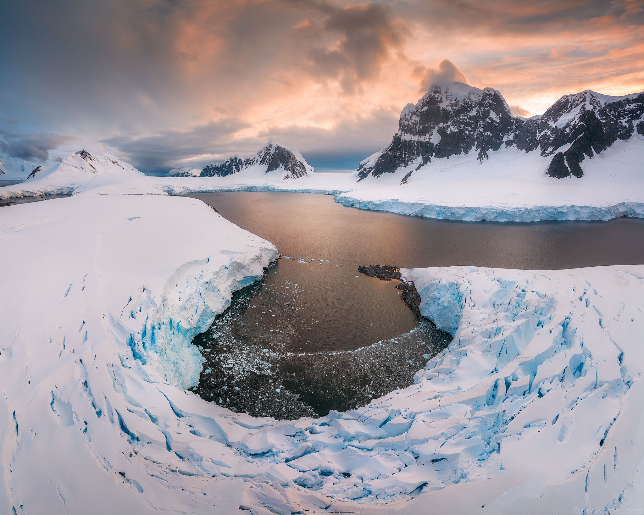 На снимке — антарктический фьорд в час заката. Ледяные образования и снежные склоны окружены тихой водой, в которой отражается драматичное небо. Сцена передаёт одновременно величие и уязвимость полярных ландшафтов. Фотограф Даниил Коржонов запечатлел момент, когда природа раскрывается в своей первозданной суровости.