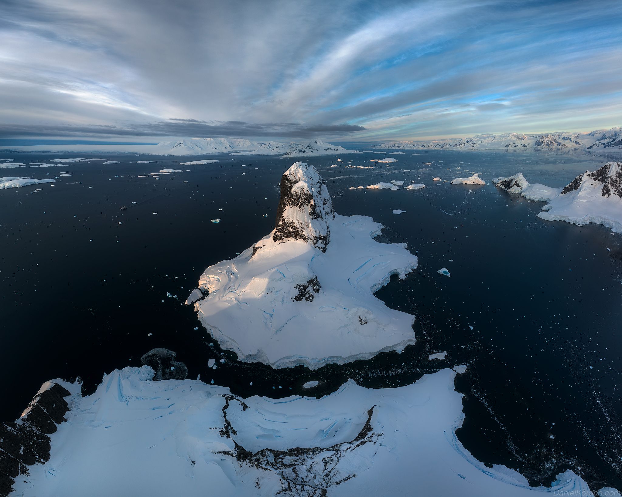 На снимке запечатлены изолированные ледяные скалы, возвышающиеся над бурным морем среди разбросанных айсбергов. Холодный свет и драматичное небо подчеркивают суровую, но завораживающую природу Антарктиды. Фотография передает ощущение одиночества и мощи природы в одном из самых отдаленных уголков Земли.