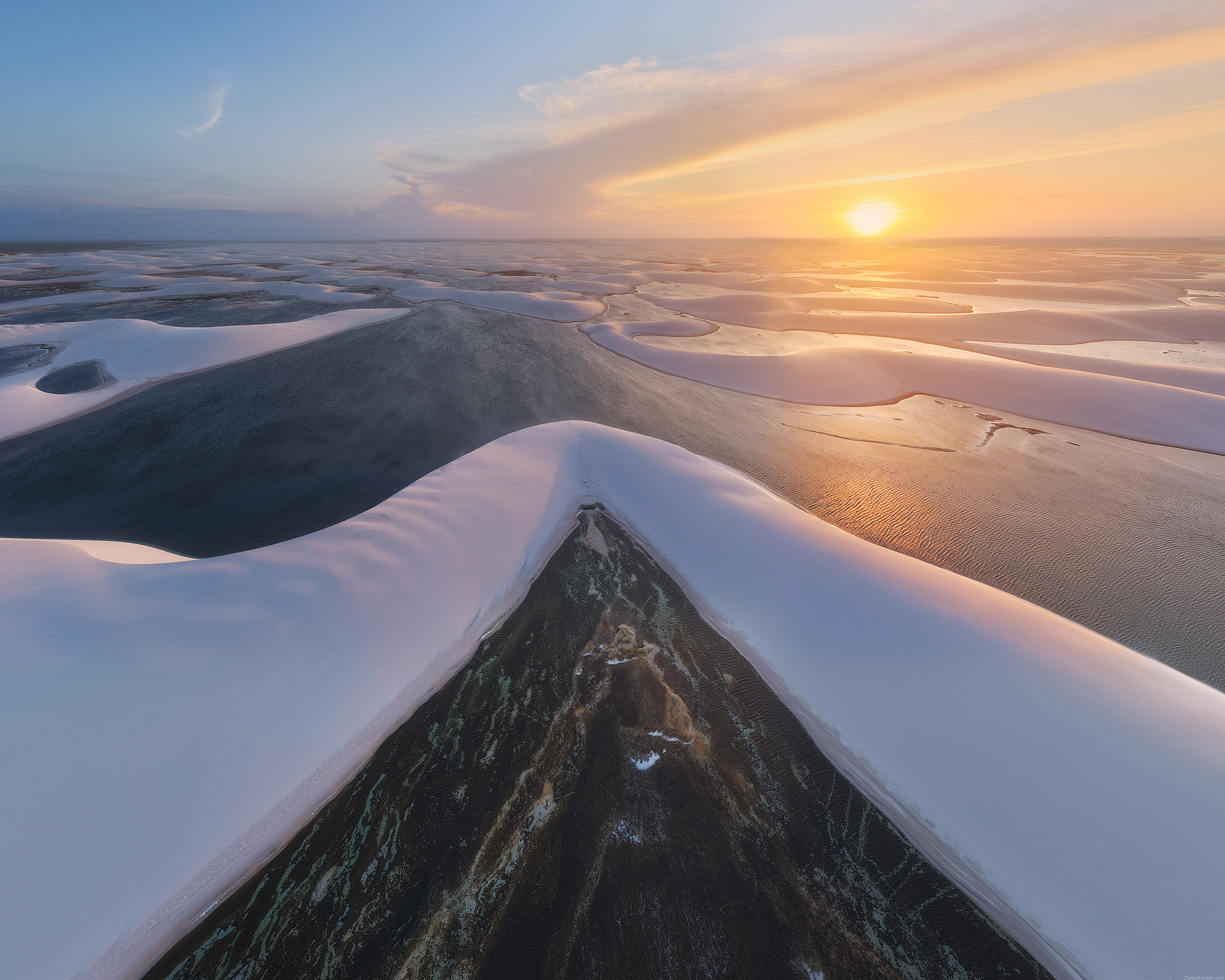 На снимке запечатлен впечатляющий зимний пейзаж — снежные холмы и ледяные поля под светом заходящего солнца. Вид с вершины подчеркивает масштаб и одиночество арктической природы. Золотистые отблески на льду и нежные оттенки неба создают атмосферу спокойствия и величия. Фотография передаёт холодную красоту и первозданную чистоту ледяного мира. Работа Даниила Коржонова.