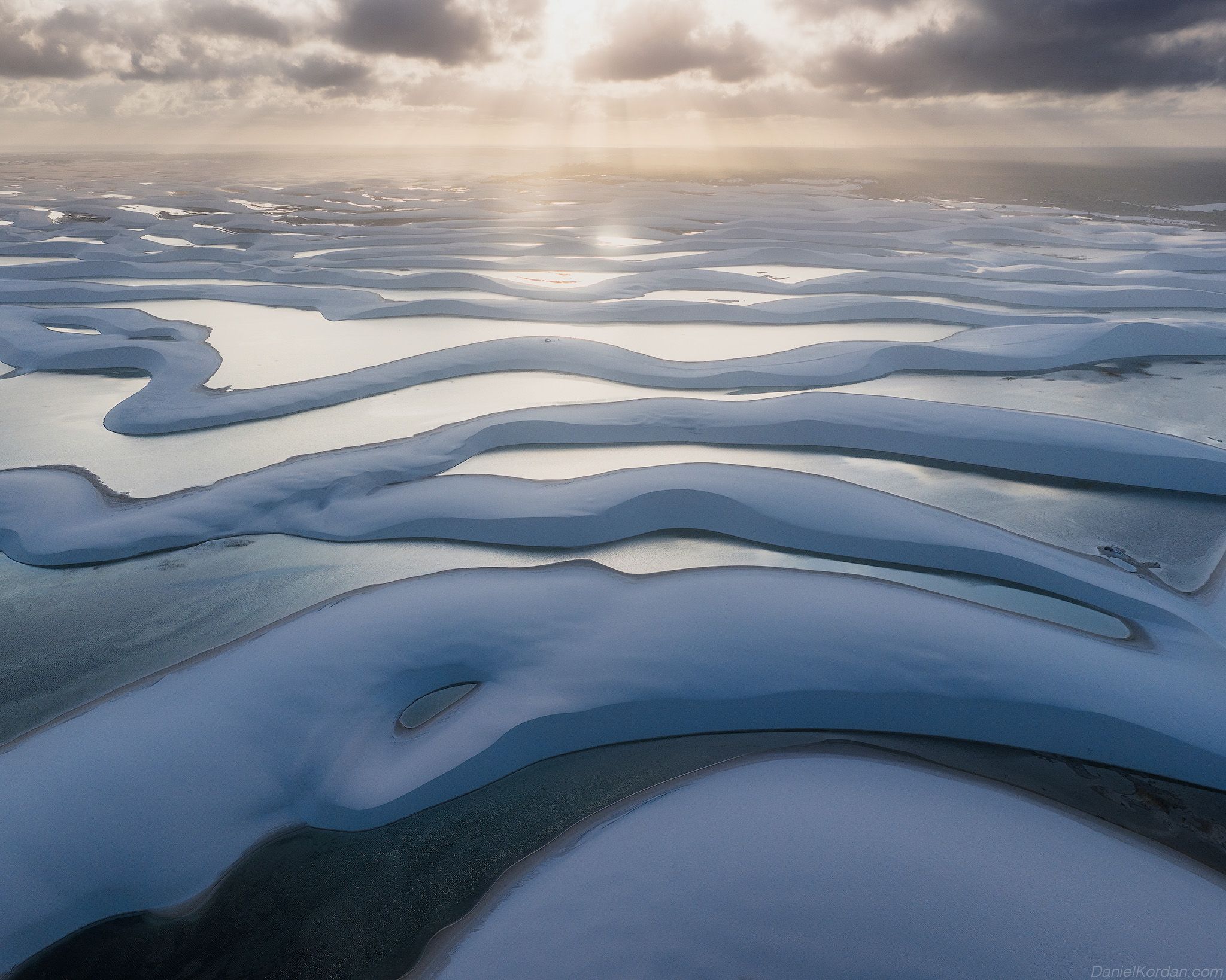 На снимке Даниила Коржонова — Ленцойс-Мараньенсис, уникальная пустыня в северо-восточной Бразилии. Песчаные дюны, похожие на снежные, пересекаются тонкими ручьями, отражающими свет. Это не зима — это влажный сезон, когда дожди наполняют впадины, создавая озёра. Контраст света и тени, глади воды и рельефа песка — как картина, где природа рисует абстракцию. Каждый кадр — отражение гармонии и хрупкости экосистемы.