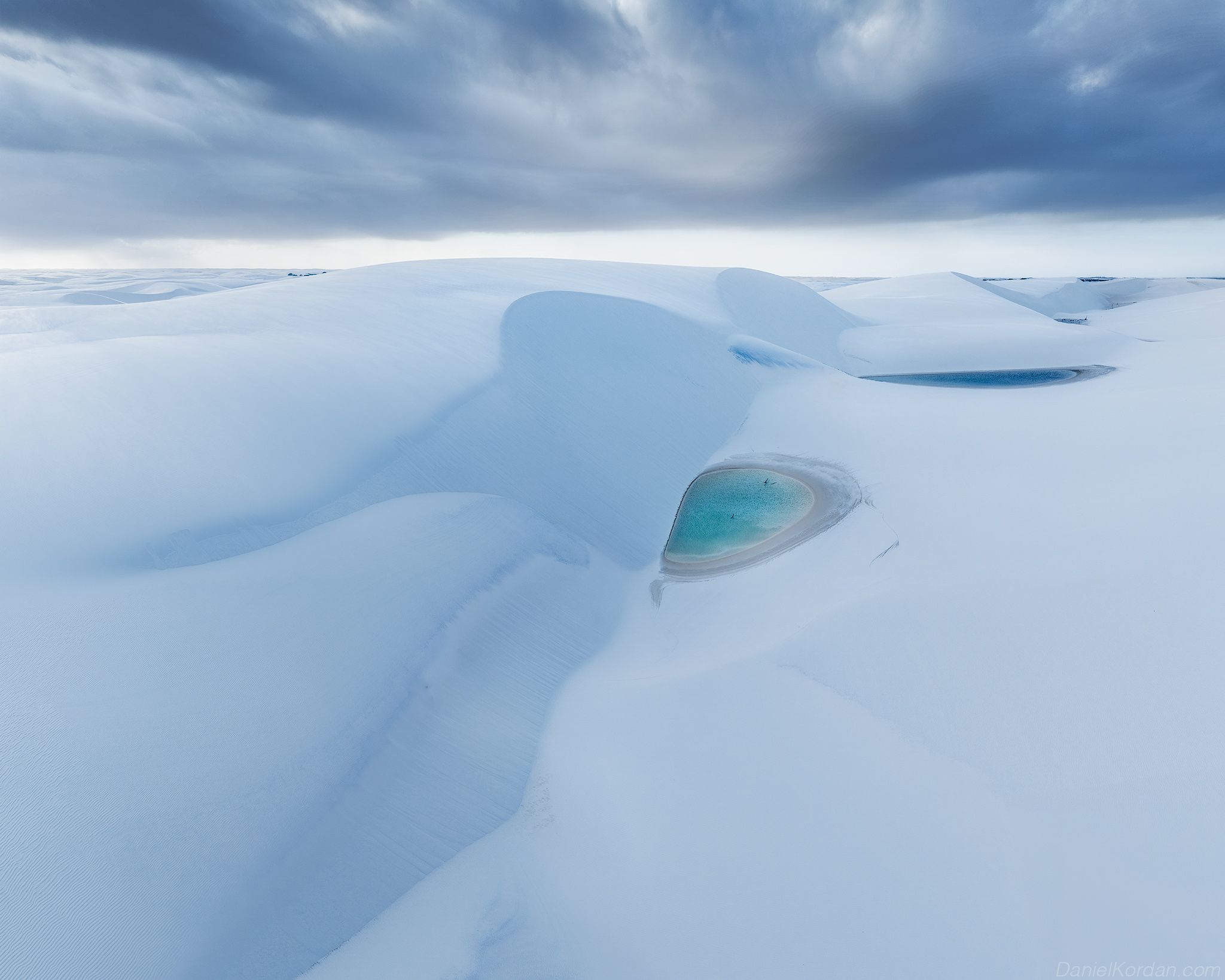 На снимке — удивительный ландшафт, напоминающий пустыню, но покрытый снегом. Гладкие, изогнутые формы снежных холмов контрастируют с ярко-бирюзовым озером, врезавшимся в ледяную поверхность. Драматическое небо добавляет глубину и напряжение сцене. Фотограф Даниил Коржонов запечатлел момент, где природа выглядит одновременно суровой и волшебной. Это не пустыня, а ледяной пейзаж, возможно, в Антарктиде или на высокогорном плато, где вода сохраняется в ледяных ямах.