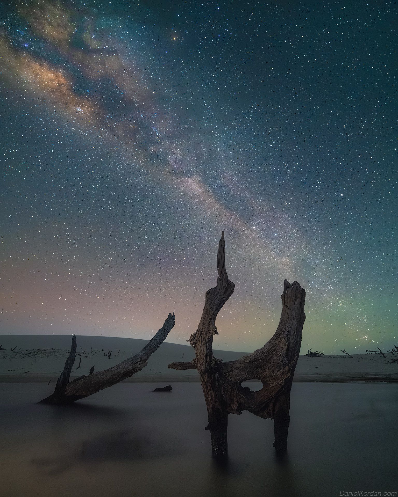 На снимке запечатлена пустыня Ленсис в Бразилии, где высохшие деревья возвышаются из песка под величественным звёздным небом. Млечный Путь простирается по небосводу, подчёркивая масштаб и тишину пейзажа. Фотография передаёт ощущение одиночества и вечности, где природа и космос сливаются в едином зрелище. Даниил Коржонов запечатлел эту сцену с высокой точностью и глубиной, подчеркивая красоту и хрупкость природы.