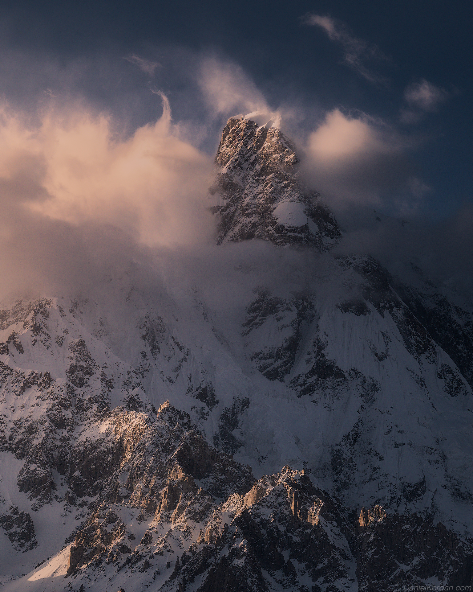 В тишине утреннего Пакистана вершина возвышается над облаками, словно божественный страж. Солнечные лучи, проникая сквозь туман, выделяют резкие контуры скал и снежных склонов, подчеркивая суровую красоту высокогорья. Каждый изгиб ледника, каждый выступ камня — свидетельство борьбы природы с временем. Фотография Даниила Коржонова захватывает мгновение, когда свет и тень создают драматическую симфонию, напоминая о величии и хрупкости мира.