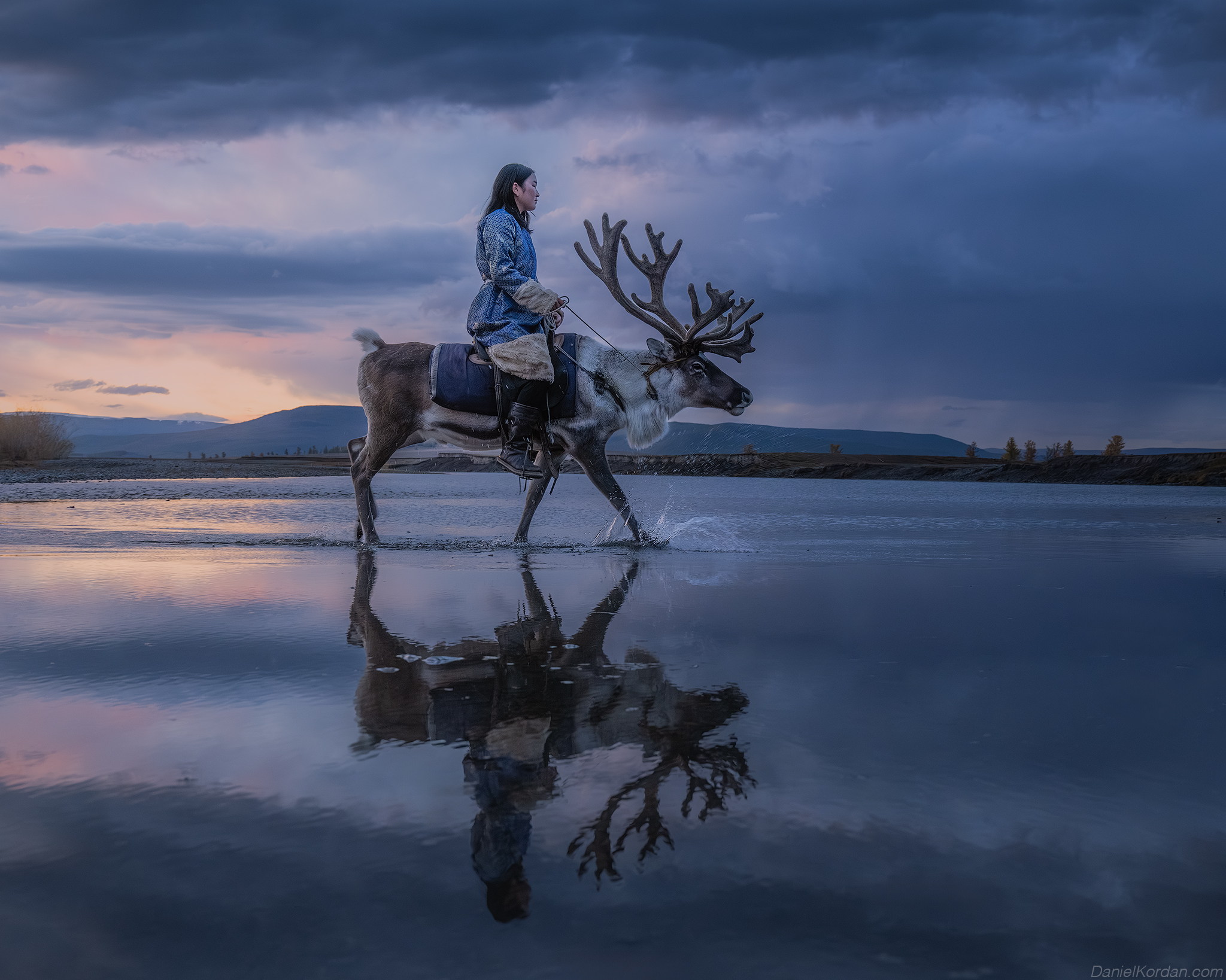 В сумерках Монголии, на фоне драматического неба, женщина-тсаатан скользит на олене по ледяной поверхности озера. Её отражение в воде создаёт почти мистическую симметрию — как будто время остановилось. Этот образ — живое воплощение тысячелетней культуры оленеводов, живущих в синхронии с природой. Каждый шаг оленя, каждый отблеск заката — часть их повседневной поэзии. Фотограф Даниил Коржонов запечатлел не просто сцену, а дыхание древнего мира.