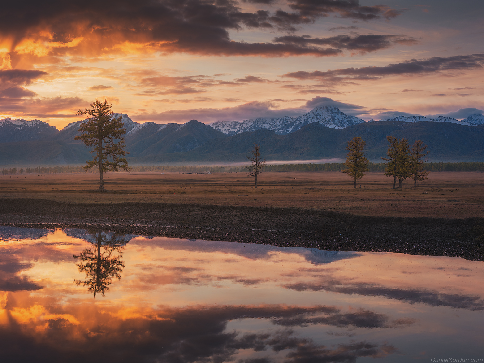 На снимке — пейзаж Монголии, где тундра уступает место снежным горам на фоне огненного заката. Вода в переднем плане идеально отражает небо и одинокие деревья, усиливая ощущение безмятежности. Фотограф Даниил Коржонов запечатлел момент, когда природа кажется одновременно суровой и прекрасной. Сцена — типичная для региона Тсаатан, где живут оленеводы.