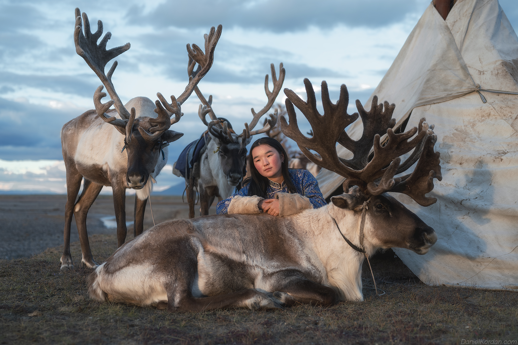 На снимке — представительница народа тсаатан, живущего в северных районах Монголии. Она сидит рядом с оленями у традиционной юрты, символизируя гармонию с природой. Олени — не только источник средств к существованию, но и часть духовной культуры. Сцена отражает устойчивый образ жизни, передаваемый из поколения в поколение. Фотография запечатлела момент спокойствия и связи с животными в суровых условиях тундры.