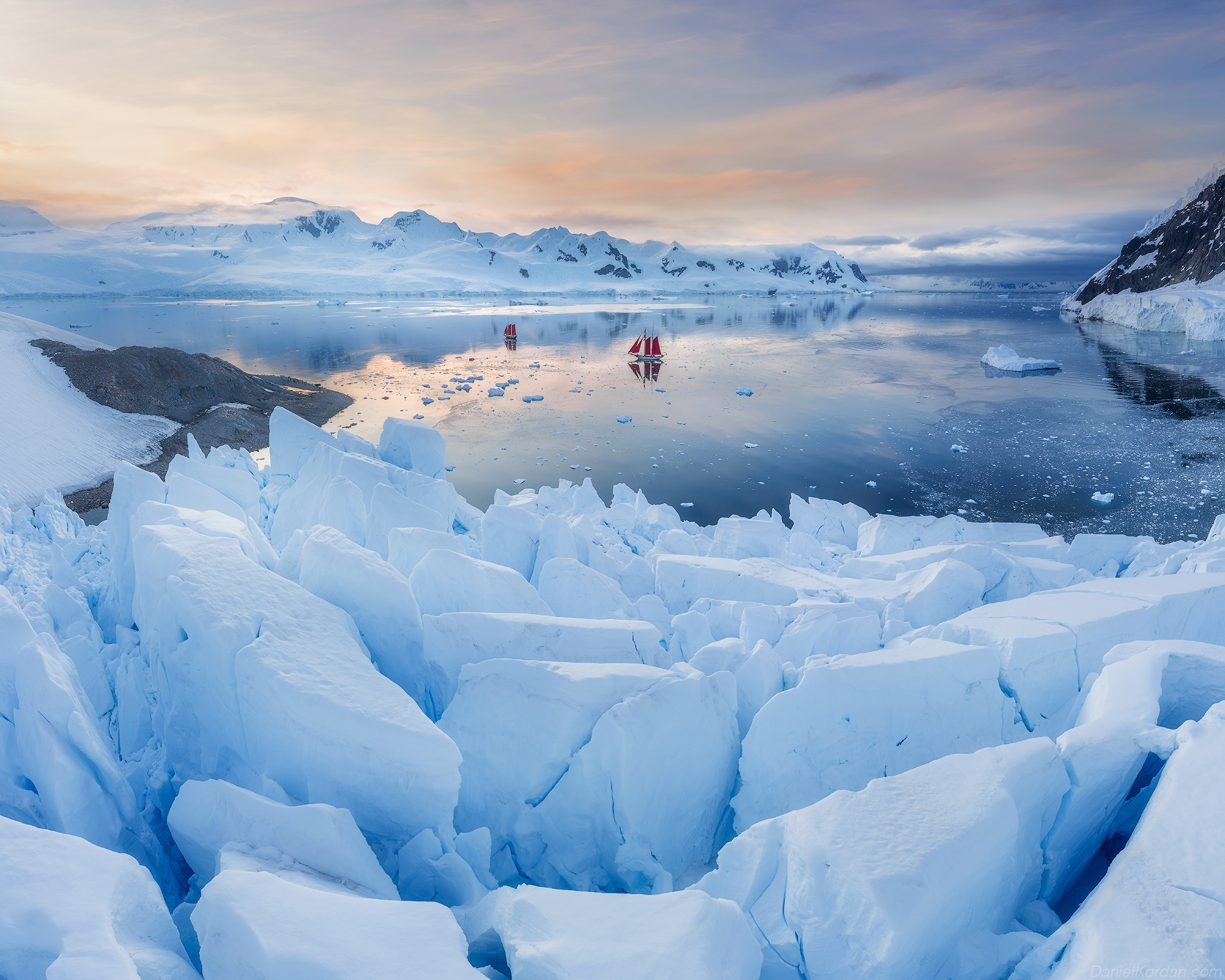 На снимке запечатлен потрясающий вид антарктического побережья в сумерках. Передний план занимают крупные блоки льда с характерными трещинами, а на заднем плане виднеются горы и отражение неба в воде. Фотография выполнена Даниилом Коржономым, который смог передать красоту и величие этого удаленного уголка планеты.