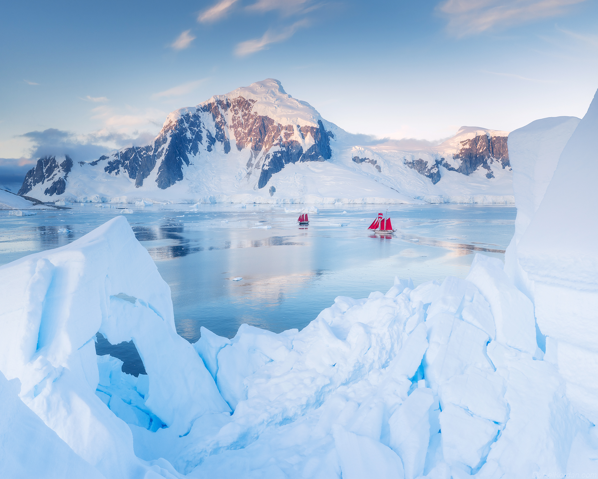Даниил, отличный кадр — холодная красота Антарктиды передана очень точно. Как удалось поймать такой свет и отражение на воде?